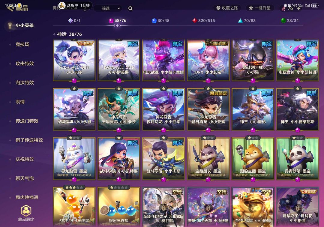 装备描述:【VIP11】可共享❤50神话英雄5神话棋盘❤至臻咖啡格温❤至臻莲华永恩❤至臻莲华月男❤至臻剪纸格温