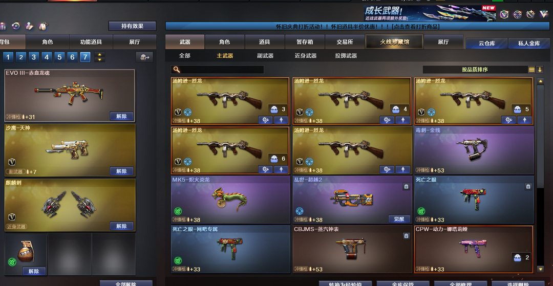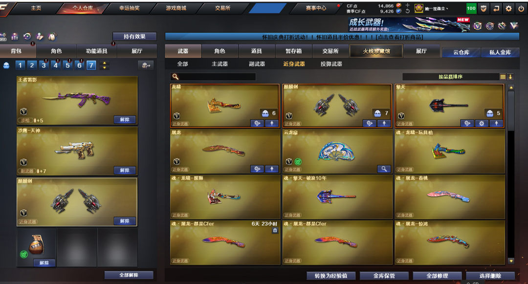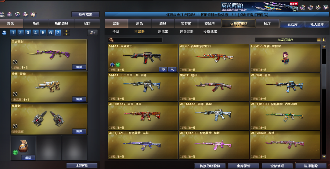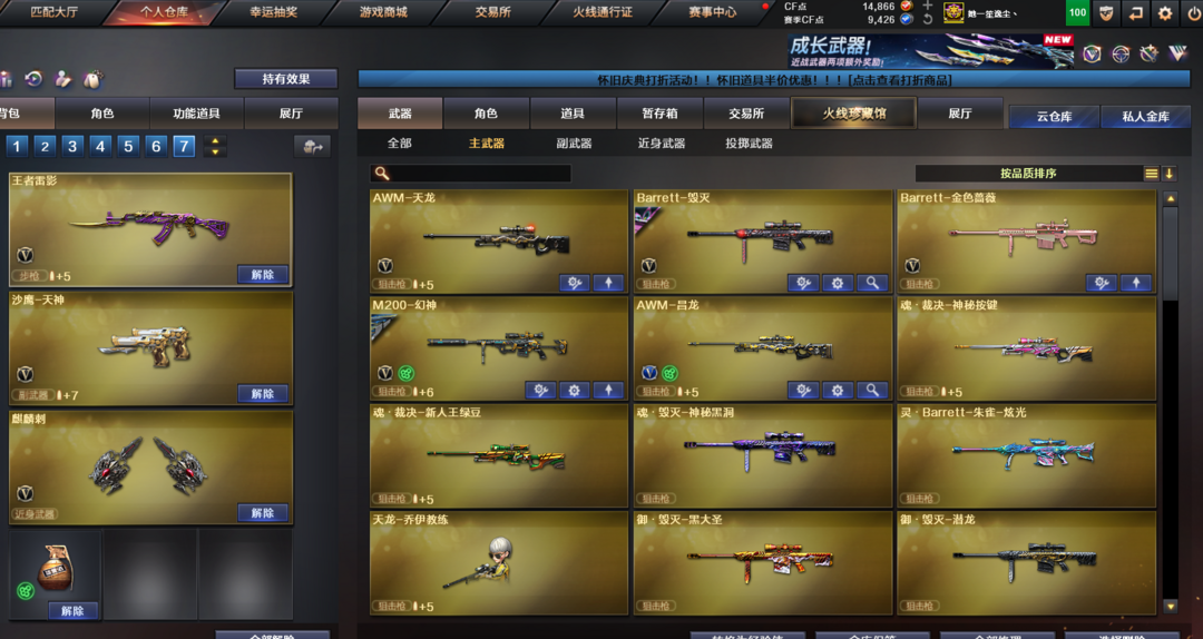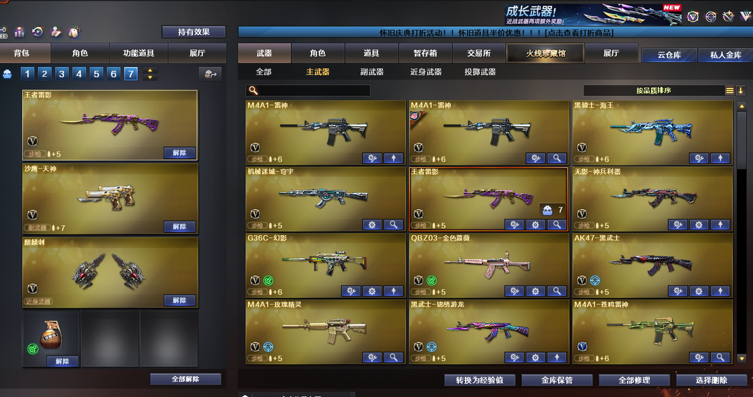 装备描述:王者武器:王者雷影;炫金骑士;炫金武士;炫金修罗 英雄武器:烈龙五把;机械迷城-穹宇;M200-幻神;G36C-幻影;M4A1-雷神;烟雾弹-云龙;云龙扇;黑武士-锦绣游龙;黑骑士-海王;烈火-动感闪耀;天神-动感闪耀;屠龙-动感闪耀;手雷-动感闪耀;无影-神兵利器;麒麟刺;AWM-天龙;QBZ03-金色蔷薇;AK47-黑武士;RPK-盘龙;Barrett-毁灭;屠龙;汤姆逊-烈龙;沙鹰-天神;擎天;沙鹰-修罗;龙啸;M4A1-玫瑰精灵双全装❤王者雷影❤G36C-幻影❤幻神-电流骇客❤五烈EVO❤Mk5-喷火龙❤四防魅影生化背包❤道具:冲锋枪弹匣;步枪弹匣;黑色枪口火焰;彩蝶之翼;生化弹匣;超级背包;防化服;疯狂宝贝;极限战斗背包;幽灵之刃;京剧背包;夺命之镰;烟雾保护头盔;闪光护目镜;防弹衣;防弹头盔;弦波科技无线电;泉枢动力水壶;绿色巨人;疯狂宝贝;防化服;C4工具钳;手雷包;防弹衣;防弹头盔;云山科技背包;智眸战术目镜;听风战术耳机;背包-洛丽塔;炫彩背包-诺拉;防化服;C4工具钳;手雷包;防弹衣;防弹头盔;灵魂忍者;迷雾幽灵;疯狂宝贝;M4A1-黑骑士音效卡;黄