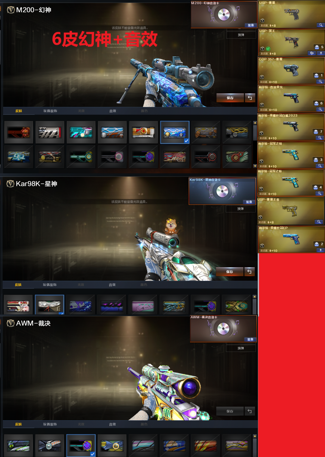 装备描述:排位:可以、、、、、、、、爆破四防:6皮幻神+音效(传奇欧欧、EP荣耀、24AG冠军、星火小队、星耀、丹凤皮肤)、M200-竞技荣光、98K星神、、、、、、USP雷暴、USP冥王、USP雷暴王者、COP雷霆、柯尔特竞技荣光、23白鲨柯尔特、2个冠军之特、EP荣耀柯尔特、、、、G36幻影、传说夜影、白虎玄豹、白虎、王者凌虎、炽芒蝶刃、、、幻神音效、裁决音效、蔷薇音效、星神音效、毁灭音效、雷神音效、、、1套雷霆、2套雷暴、1套堕天神、3套竞技荣光、2套玄豹、2套雷暴王者、、、生化四防(妮妮、关小雨、王者魅影、王者潘多拉)