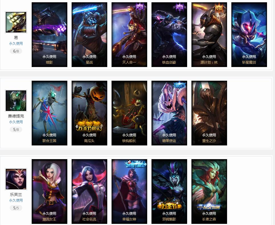 装备描述:请不要随意撤单,天天有人逃跑,连人机都有人逃跑,时间不够一场游戏时间请不要继续或请续费后继续游戏,谢谢。【不要逃跑,不要挂机,否则拉黑。】 海克斯安妮 海克斯人马 海克斯摄魂者VN 掠星剑圣 黑牛头 全美少女 全电玩 全情人节 特殊限定除龙虾龙猴龙刀没有 其他全部都有! 人节