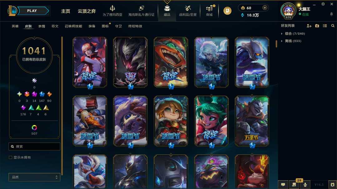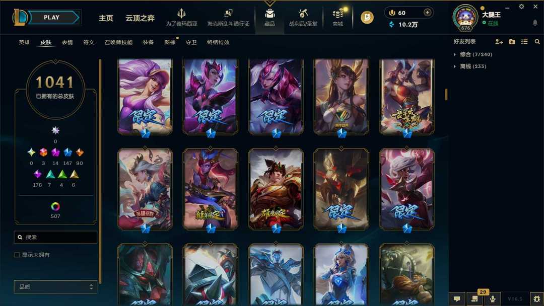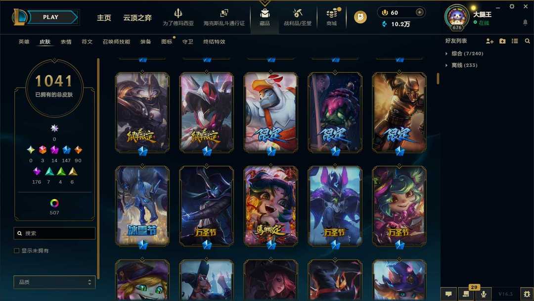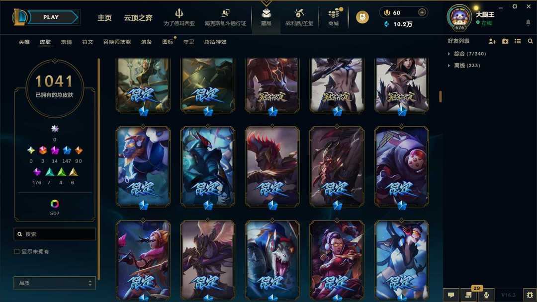 【泡泡】1550皮肤♥1041原皮♥507炫彩♥29臻彩♥14神话♥147限定♥3终极♥175史诗♥