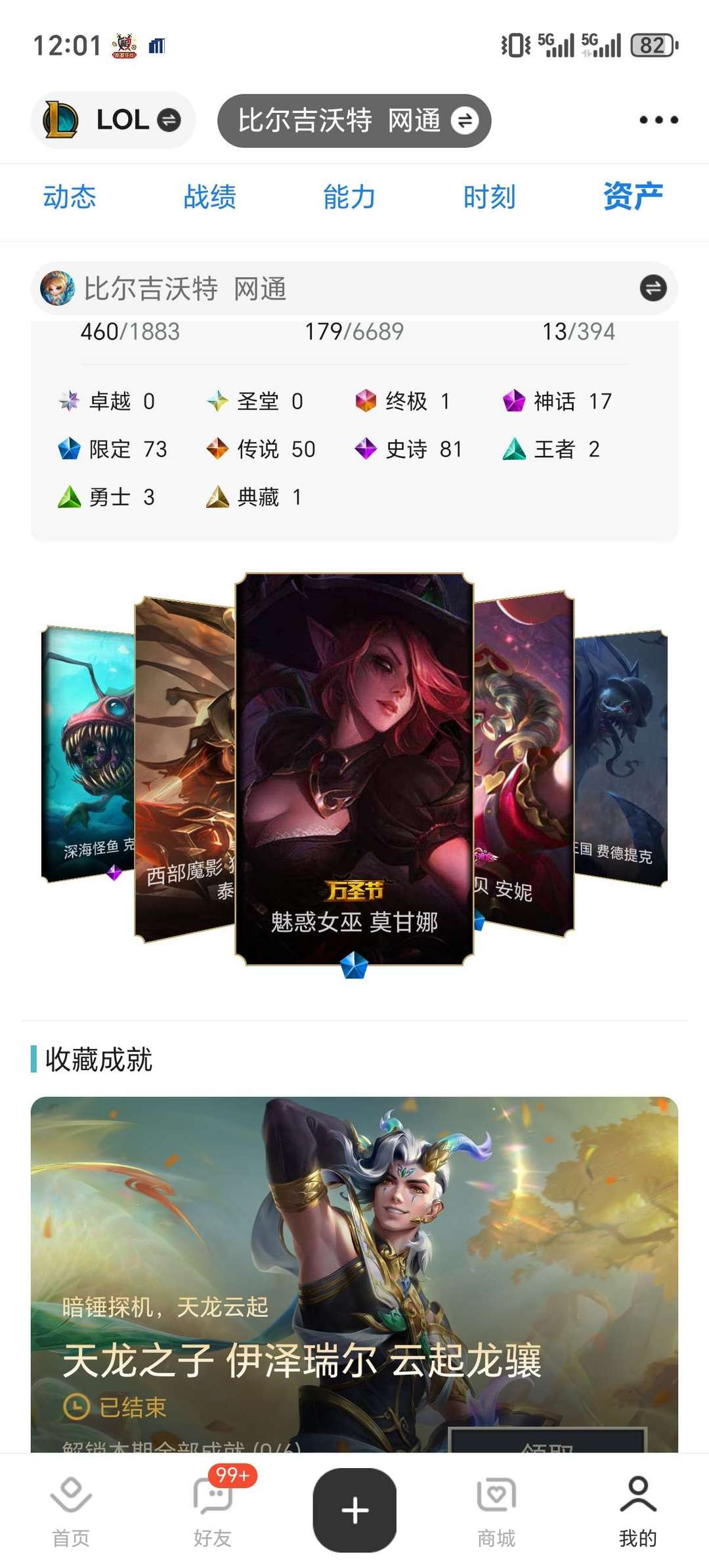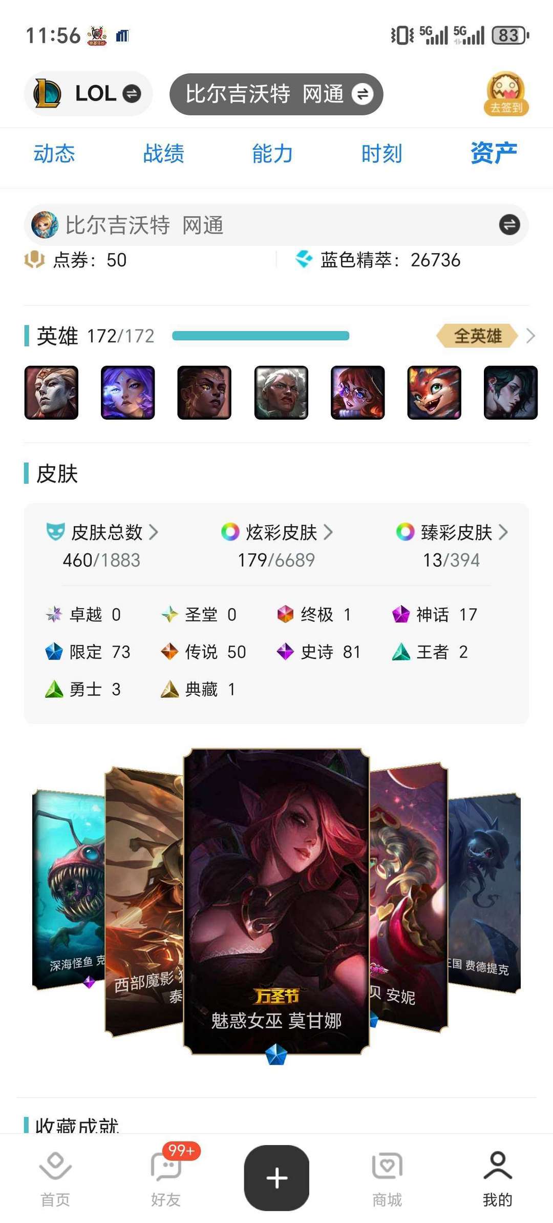 带妹低段多皮460皮18神话50传说73限定81史诗,可加好友可排位