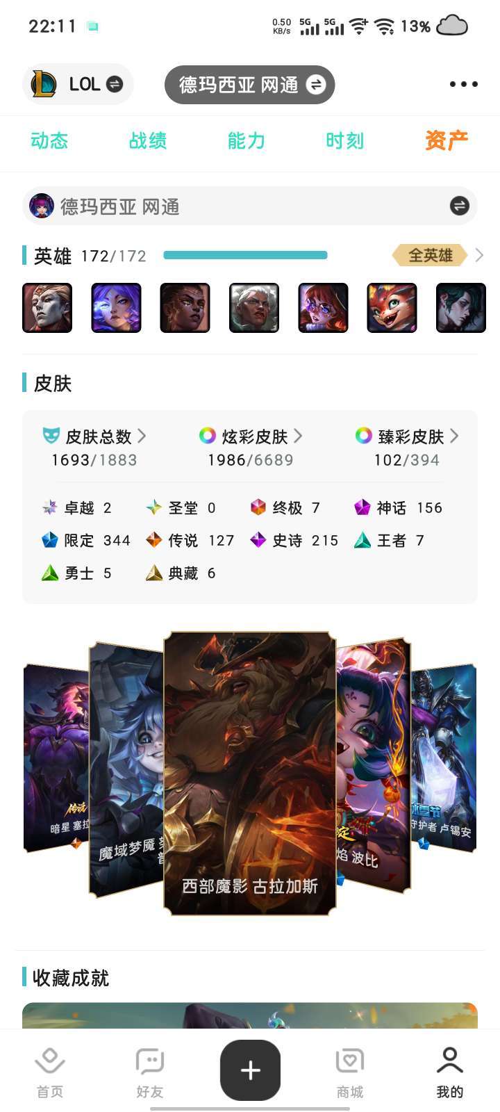 网五德玛西亚纯皮肤1693,双顶级名人堂。