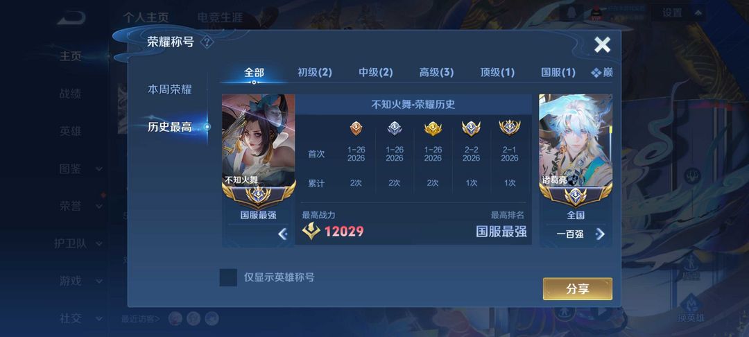 巅峰闪电框✨2月在榜国服不知火舞小国诸葛亮✨高胜高评✨可排位禁巅峰✨挂机扣分打巅峰必拉黑!人品好客来