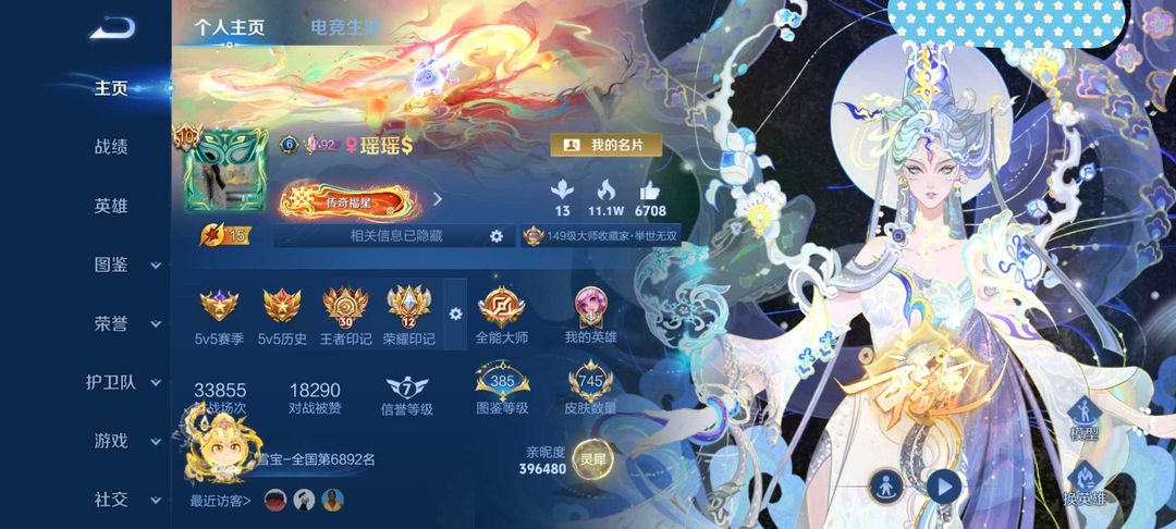 禁挂封号追赔8w 745皮荣耀贵族【国服第一富婆瑶】十周年全套 图鉴387级 满灵宝满天幕按键星