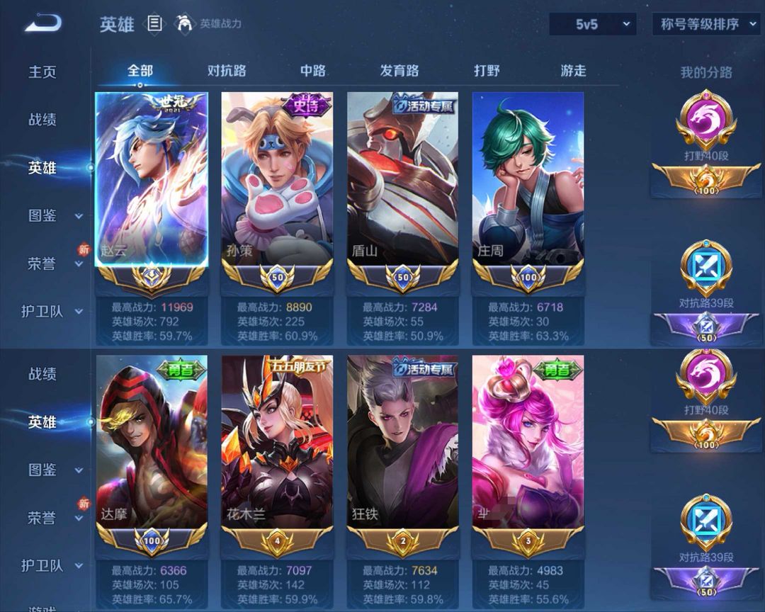 本月在榜省标赵云⭐赵云历史大国标⭐四小国标(孙策➕盾山➕庄周➕达摩)⭐打野40段|对抗路39段