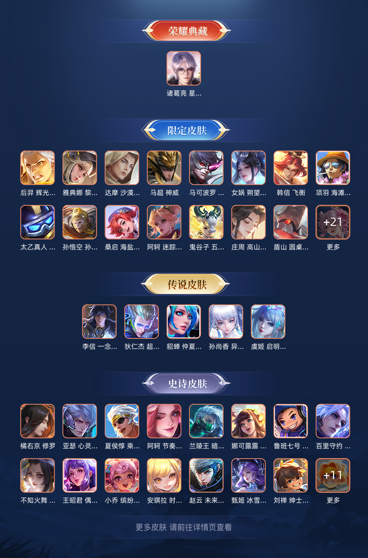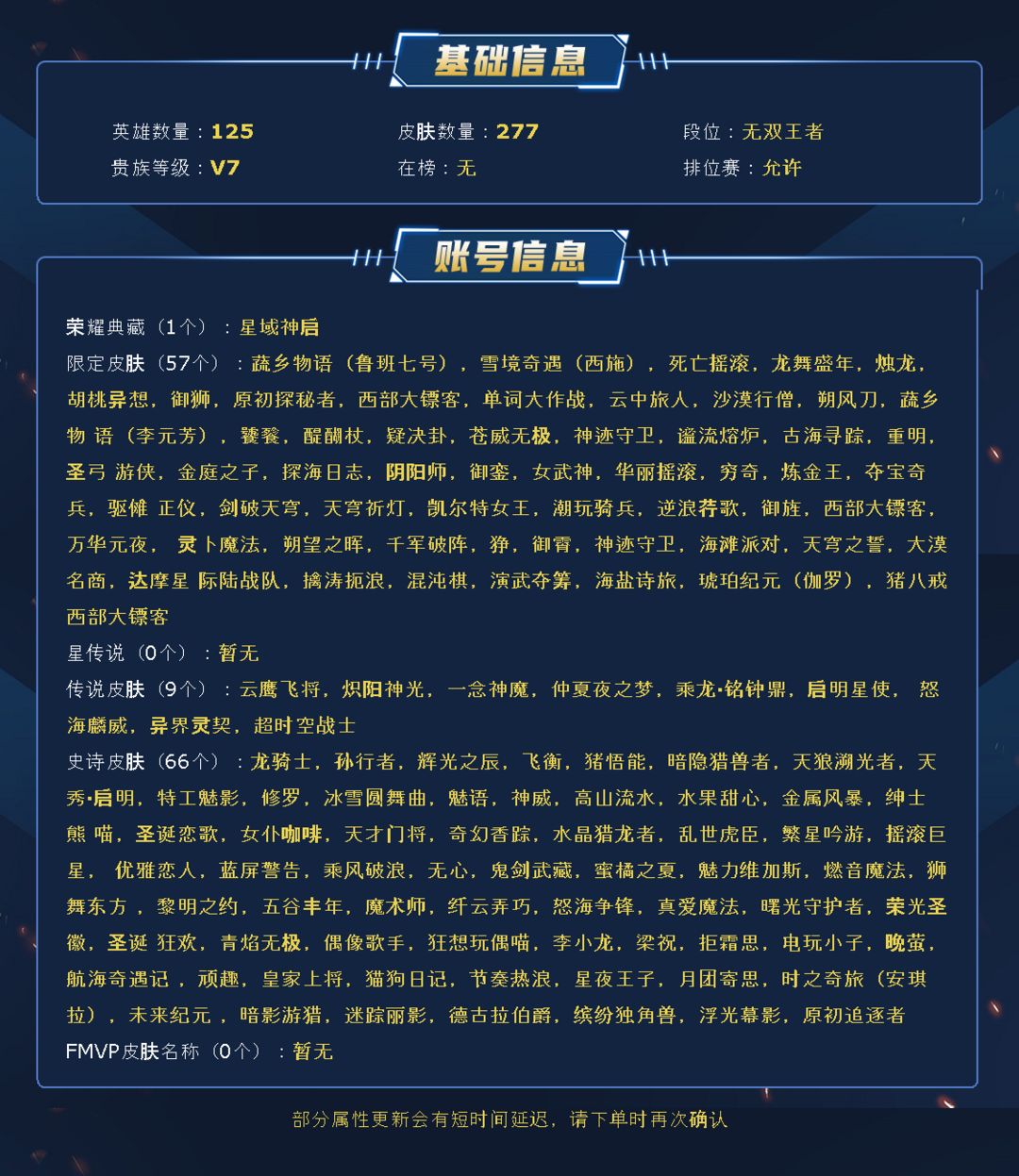 装备描述:贵族等级无,英雄数量123,典藏皮肤数1,皮肤数量264,街头霸王飞衡梁祝星域神启孙行者异界灵契神威/