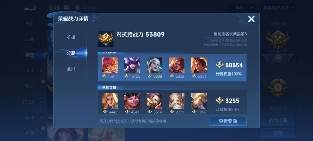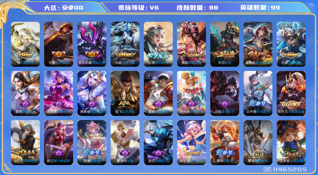 装备描述:53段对抗路1.5w小国马超1.59w小国花木兰魔方亮贵族等级: V6 英雄数: 99 皮肤数: 88 传说皮: 炽阳神光,地狱之眼,时之恋人-刘备,无双飞将,鹤归松栖(云缨) 限定皮: 游园惊梦,武圣,寅虎·赤拳,怒海麟威