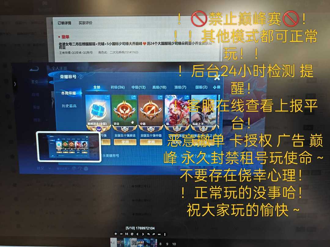 限制: 租号4次及以上 |装备描述:店铺内大多数号均可低价包天喔 本周截图❤️ 恶意挂机撤单永久拉黑平台记录 禁止巅峰赛● ★开挂美化包等违规第三方软件导致封号将会平台申诉封其租号玩账号并追究其法律责任 ★恶意撤秒改密码顶号拉黑并申诉追回租金 喜欢此账号租号玩平台直接租赁即可 ●以下违规情况扣除保证金①该账号禁止改名 ②违规导致扣信誉积分③非法发言导致账号禁言④聊天记录出现诈骗记录⑤禁止巅峰赛 打巅峰拉黑 租号玩管理员将24小时通过后台监控!