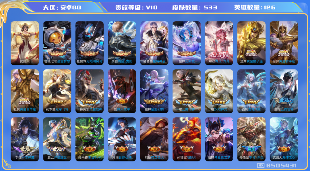 装备描述:47区 10典藏 92传说3无双 实名: 可修改 性别: 女号 贵族等级: V10 英雄数: 126 皮肤数: 533 荣耀水晶: 武则天,星空梦想,无限飓风号,鸣剑·曳影,星域神启,幻阙歌 无双皮: 青丘·九尾 传说皮: 黄金狮子座,黄金射手座,冠军飞将,云鹰飞将,绛天战甲,黄金白羊座,猫影幻舞,久胜战神,炽阳神光,一念神魔,云霓雀翎,末日机甲-孙尚香,地狱火,仲夏夜之梦,零号·赤焰,海洋之心,地狱之眼,飞鸢探春,音你心动-周瑜,胖达荣荣,李逍遥,乞巧织情,时之恋人-刘备,游龙清影,淬星耀世,超时空战士-狄仁杰,遇见胡旋,末日机甲-孙策,挚爱之约,挚爱花嫁,无双飞将,音你闪耀,碎云,神器·狴犴令,山海·炽霜斩,山海·琳琅生,山海·苍雷引,炽翼辉光,燃星之曲,画中仙,浮生妄,记忆之芯,青丘·九尾,追逃游戏(亚瑟),追逃游戏(安琪拉),灼幽烈阳,妄想实况,艾琳觅芳踪,乘龙·问璇玑,乘龙·铭钟鼎,死亡执政官 限定皮: 冰锋战神,遇见飞天,李小龙,奔雷神使,祈雪灵祝,游园惊梦,梁祝,御风骁将,云端筑梦师,时雨天司,龙胆,白鹤梁神女,武圣,辉光之辰,异界灵契,白晶晶,岱宗,天狼溯光者,天魔缭