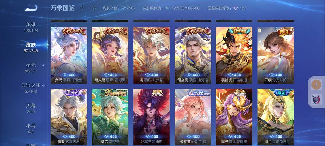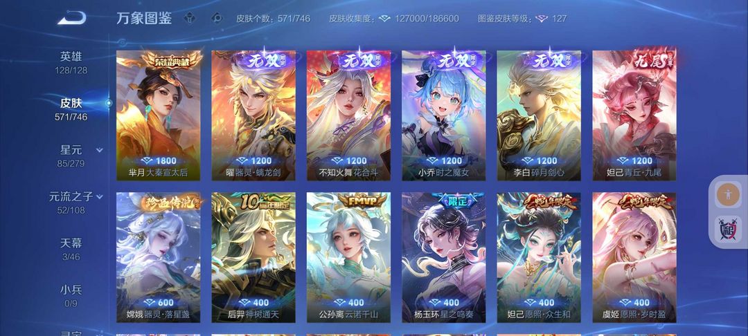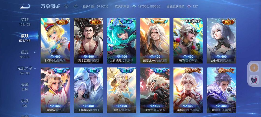 贵族10❤️571皮肤❤️14典藏5无双1珍品传说87传说满蛇年公孙离fmvp
