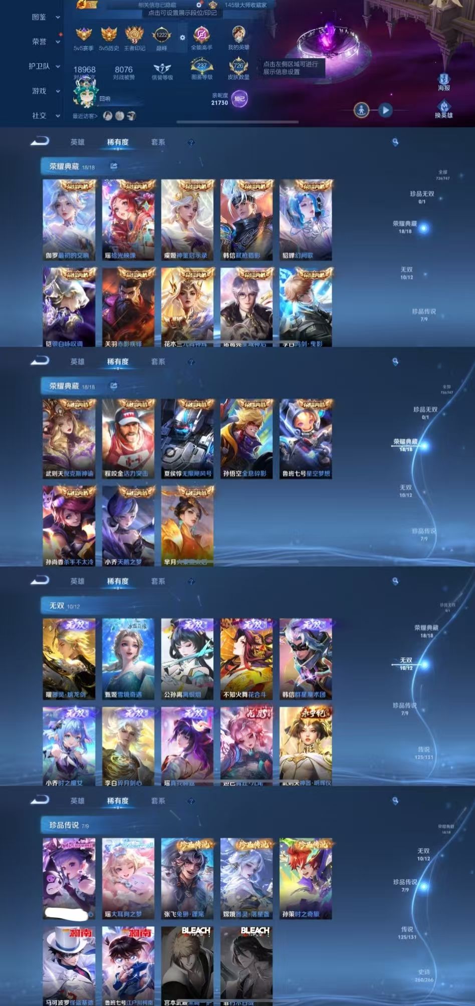 限制: 租号2次及以上 | 撤单率<49%才可租用此帐号装备描述:时间到了还登录白玩或者顶号全部改密拉黑处理永不解除,顶号机器会秒禁玩改密,顶号不仅拉黑还没得玩,赚三两块不容易,请理解谢谢。 ❤❤❤❤❤❤❤❤❤❤❤❤❤❤❤❤❤❤❤ 请勿开挂,挂机,送头,骂人,撤单后游戏等如有违规永久拉黑永不解除。 重置二级密码不要费劲了,号主每天都会上号查看,多行不义必自毙,人在做天在看,多做好事多自律,少做缺德事。 该号英雄128个皮726个,典藏20个,无双10个,珍品传说7个,星传说18个,传说125个,史诗260个,祝您游戏愉快~