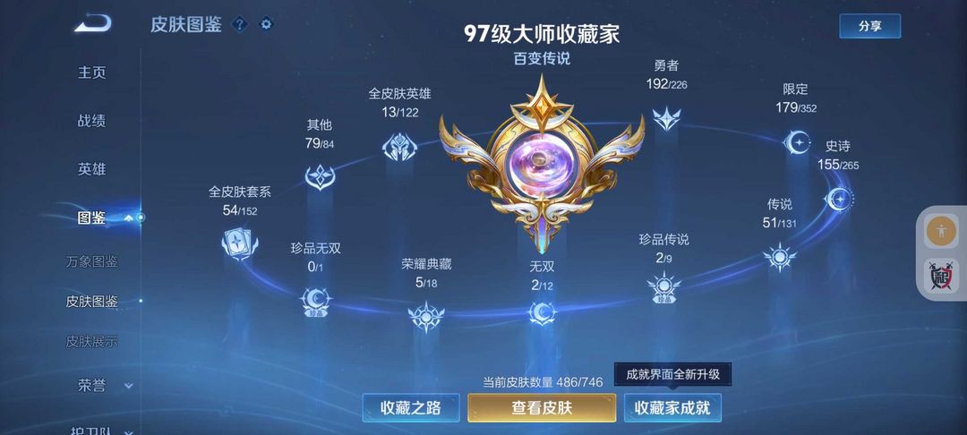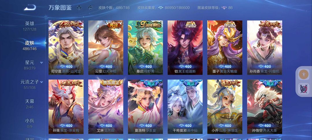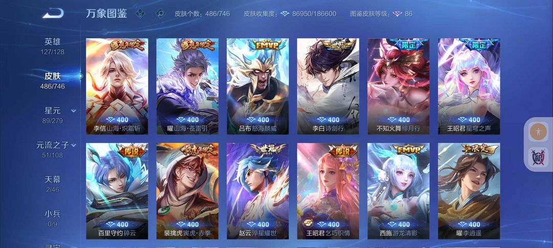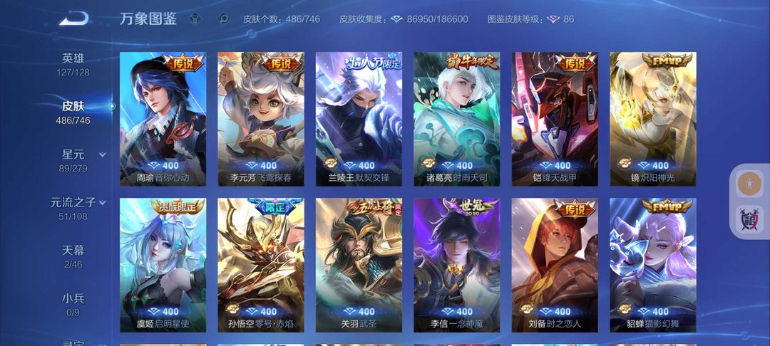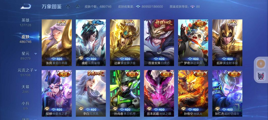装备描述:486皮肤❤️5水晶2无双2珍品❤️蛇年限定皮❤️51传说皮肤