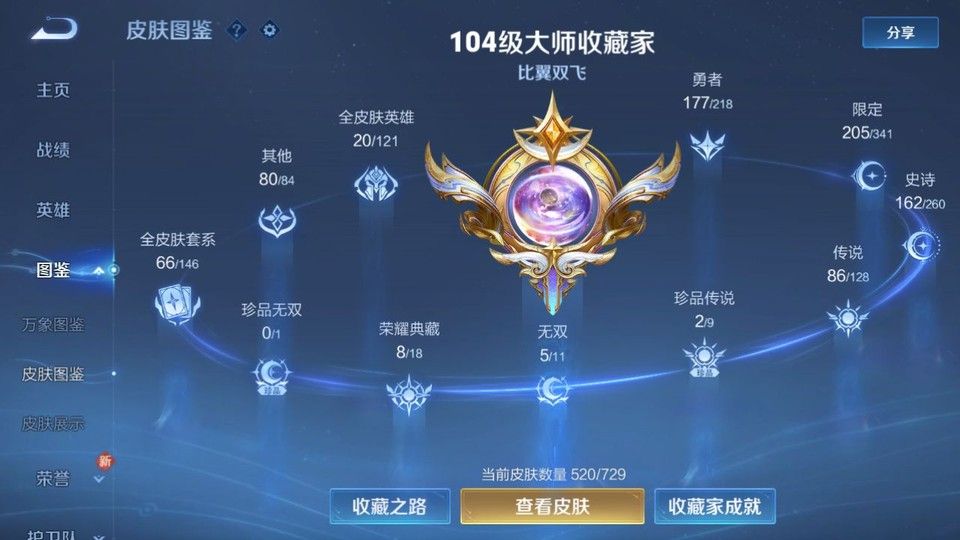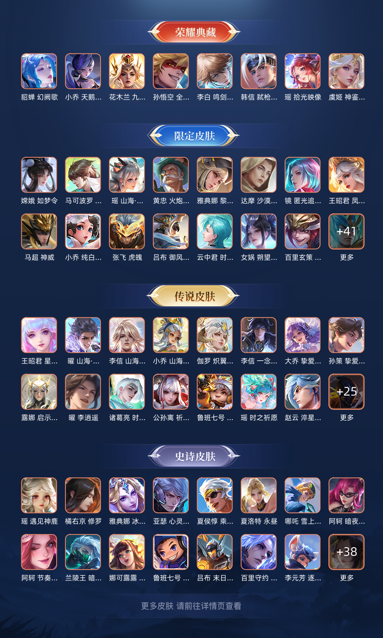 装备描述:荣耀水晶: 天鹅之梦,鸣剑·曳影,全息碎影,九霄神辉,幻阙歌,弑枪猎影,神鉴启示录,拾光映像 无双皮: 真我赫兹(瑶),青丘·九尾,碎月剑心,韩信群星魔术团,花合斗 珍品传说: 江户川柯南,怪盗基德 传说皮: 黄金射手座,云鹰飞将,黄金白羊座,猫影幻舞,炽阳神光,一念神魔,云霓雀翎,地狱火,仲夏夜之梦,音你心动-小乔,零号·赤焰,地狱之眼,音你心动-周瑜,李逍遥,乞巧织情,时之恋人-刘备,游龙清影,淬星耀世,超时空战士-狄仁杰,遇见胡旋,末日机甲-孙策,花朝如约,挚爱之约,挚爱花嫁,无双飞将,音你闪耀,碎云,神器·狴犴令,山海·炽霜斩,山海·琳琅生,山海·苍雷引,炽翼辉光,燃星之曲,画中仙,浮生妄,记忆之芯,青丘·九尾,电玩·雷克斯,鹤羽星尊,妄想实况,妄想奇谈,鹤归松栖(云缨),惊梅引,鲁班七号-时之奇旅,大乔-时之奇旅,永恒水手月亮,夜礼服假面,霜月吟,澜逐花归海,艾琳觅芳踪,琥珀纪元铠,琥珀纪元马超,貂蝉曦玄引,吕布曦玄引,金乌负日,黄金天蝎座,云中君群星魔术团,朵莉亚心动手记 限定皮: 遇见飞天,李小龙,祈雪灵祝,梁祝,御风骁将,时雨天司,魔法小厨娘,异界灵契,岱宗,虎魄,天魔