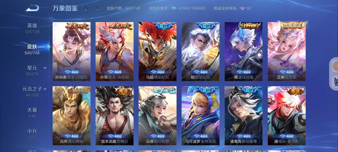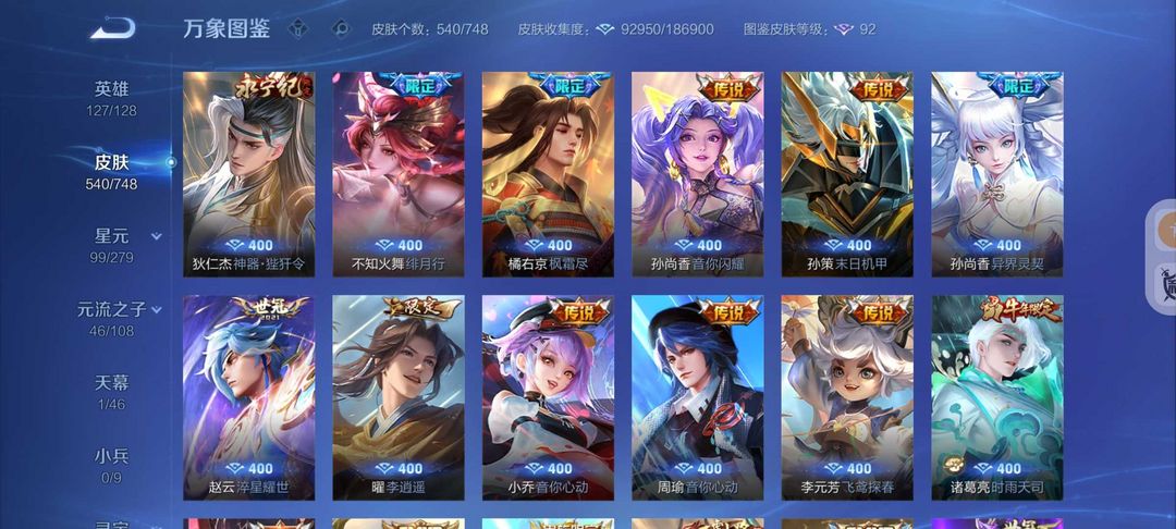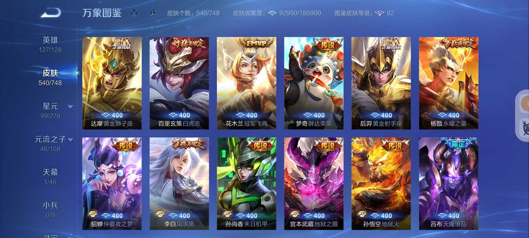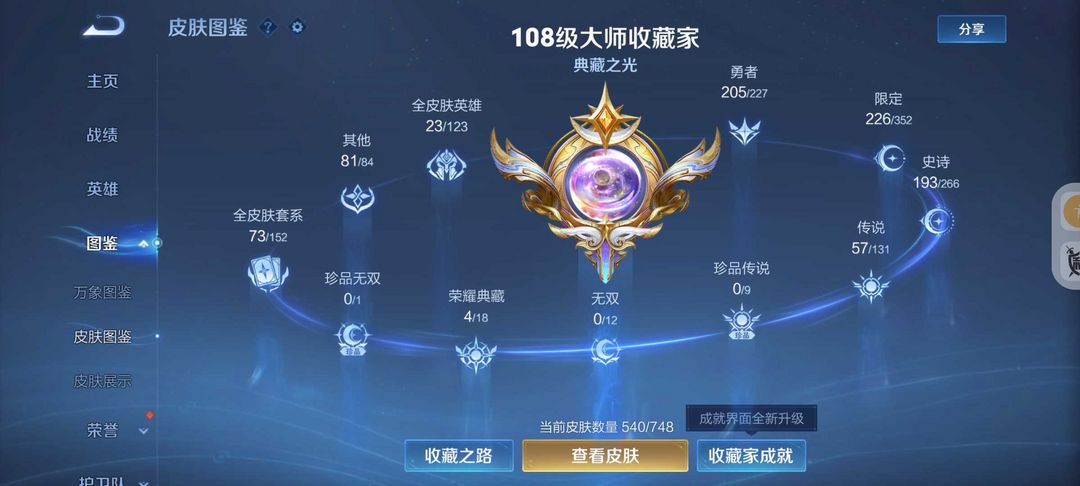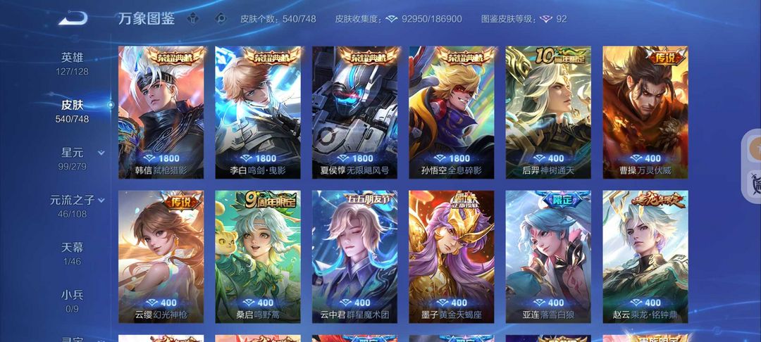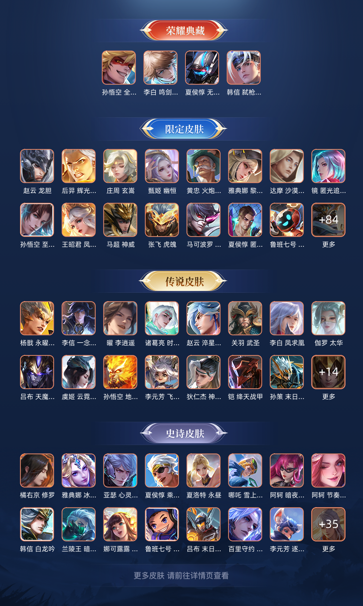 装备描述:540皮肤4水晶号❤️十周年限定皮❤️57传说皮❤️鸣剑❤️满龙年限定皮❤️