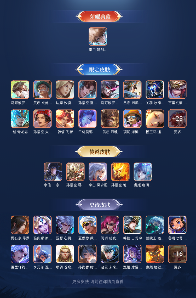 装备描述:荣耀水晶: 鸣剑·曳影 传说皮: 云鹰飞将,一念神魔,地狱火,零号·赤焰,时之恋人-刘备 限定皮: 冰锋战神,遇见飞天,李小龙,梁祝,御风骁将,烈魂,天狼溯光者,飞衡,天狼征服者,冰霜恋舞曲,逐梦之影,凤求凰,白虎志,青龙志,至尊宝,大圣娶亲,默契交锋-花木兰,山海·玄木吟