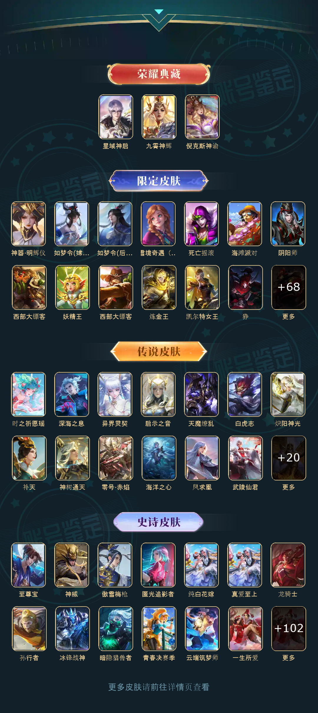 装备描述:贵族等级V10,英雄数量127,典藏皮肤数3,皮肤数量410,冰锋战神街头霸王纯白花嫁天魔缭乱至尊宝真爱至上凤求凰武陵仙君黄金狮子座一生所爱大圣娶亲白虎志朱雀志梁祝倪克斯神谕匿光追影者星域神启孙行者补天异界灵契神威启示之音傲雪梅枪淬星耀世