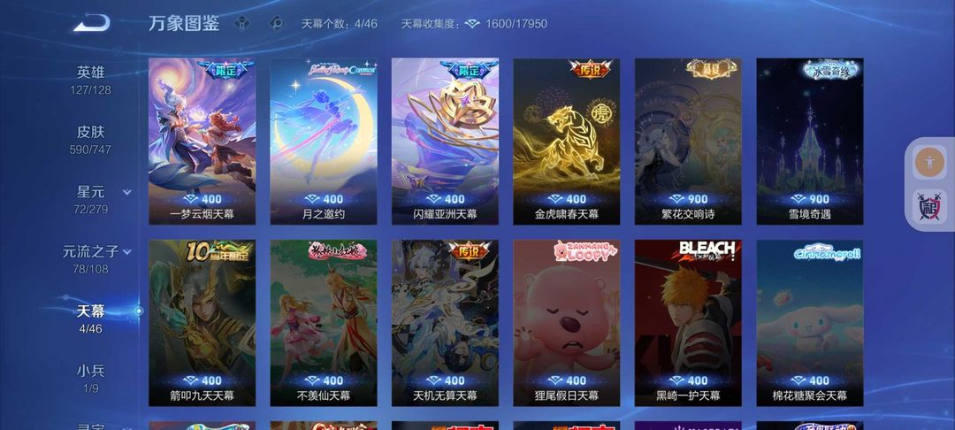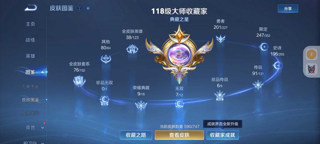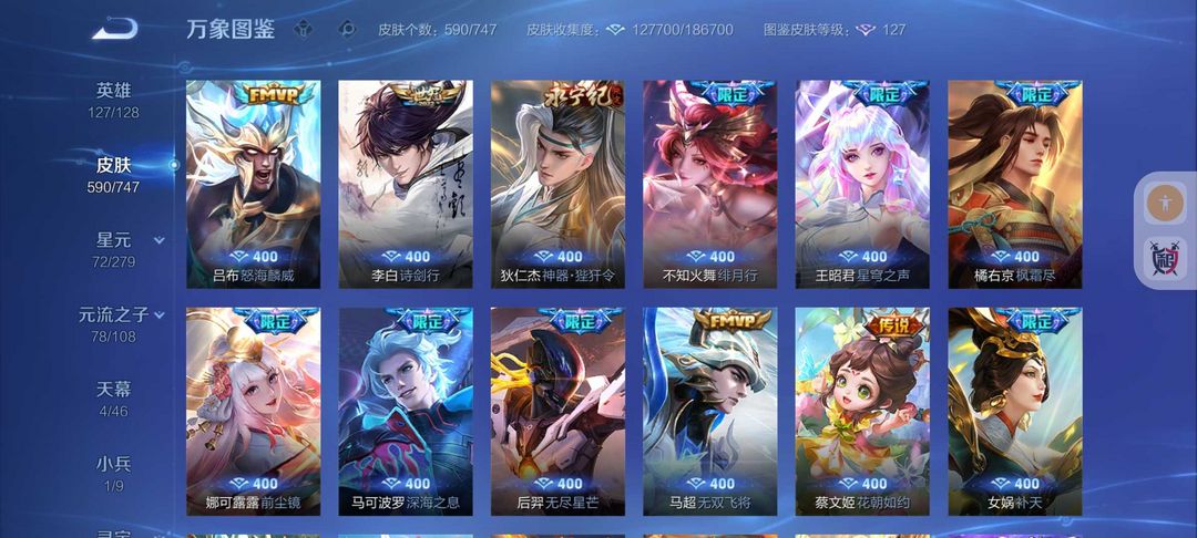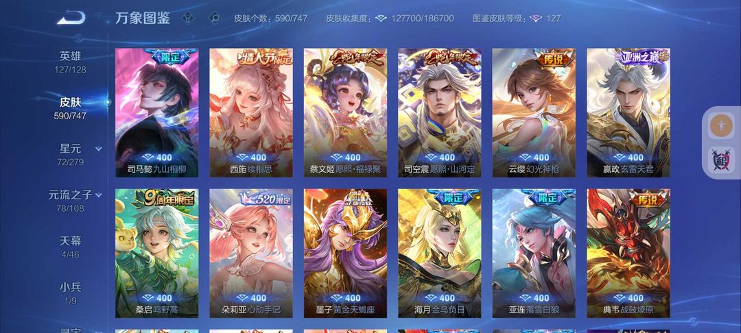 装备描述:无双V10❤590皮肤❤️11水晶7无双❤️大耳狗小兵❤️凯水晶❤️天机白泽宫本暃珍品❤️91传说皮❤️万灵伏威