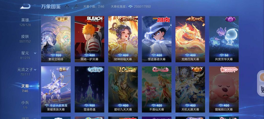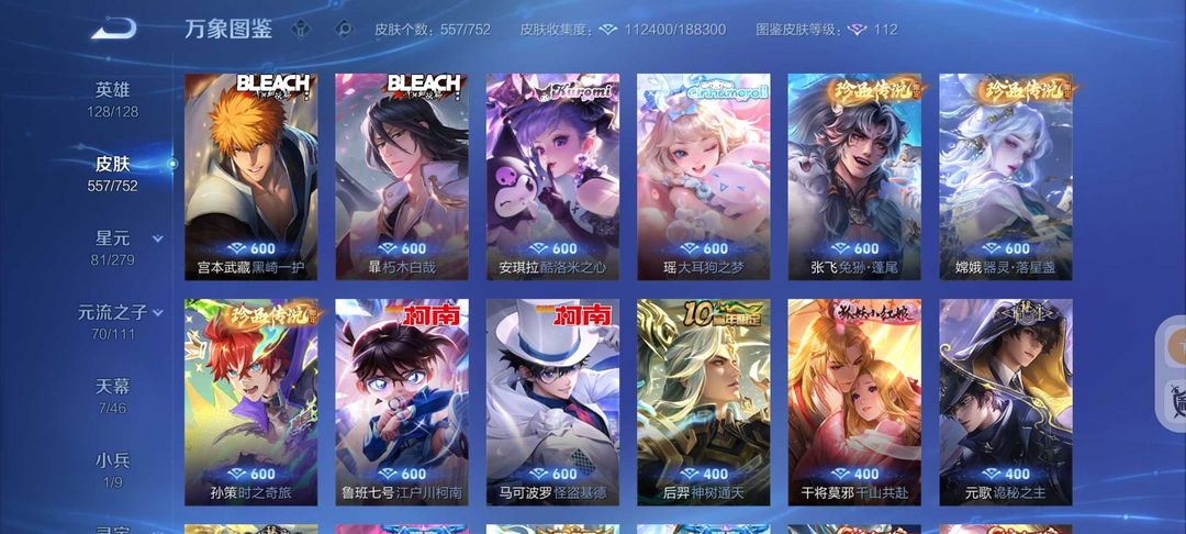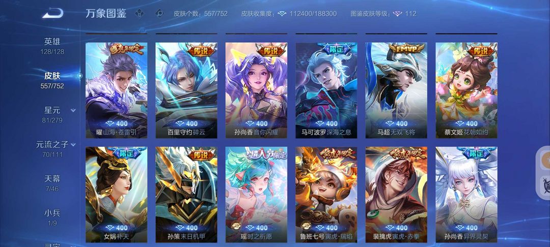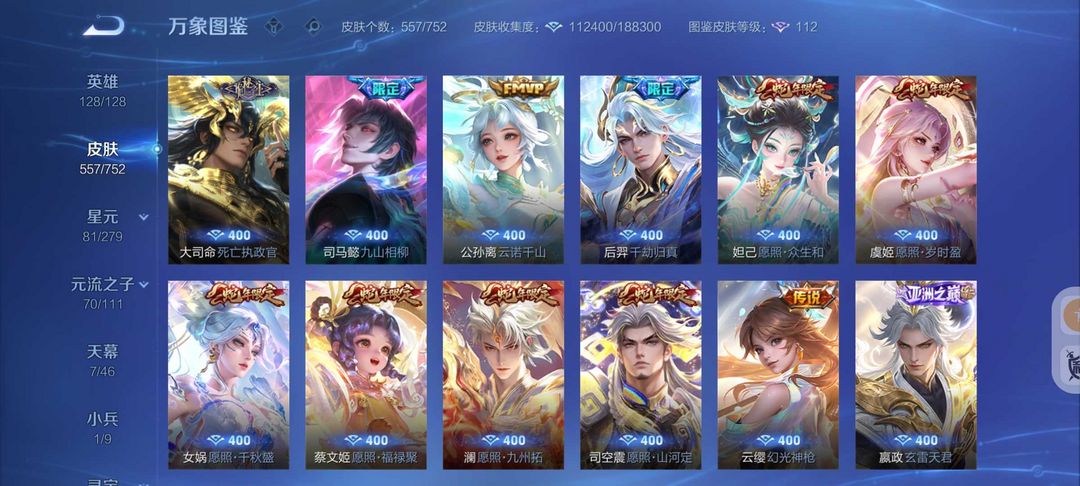 装备描述:荣耀V10号❤美神临世❤中路51段万战武则天奕星❤冰雪小兵貂蝉慕夏天幕珍品无双❤满珍品554皮5水晶6无双