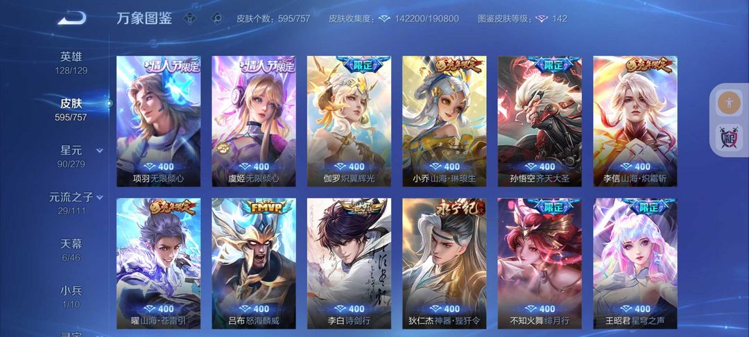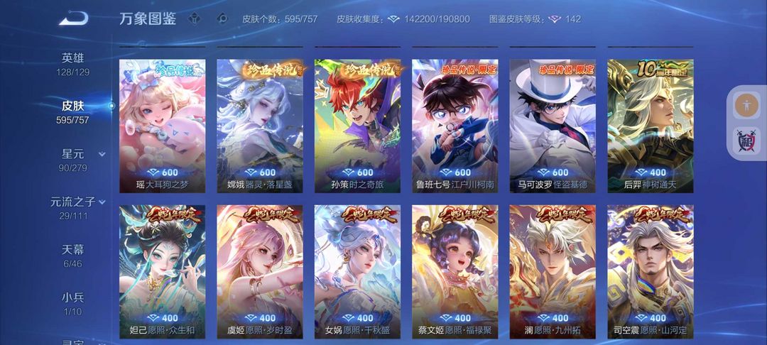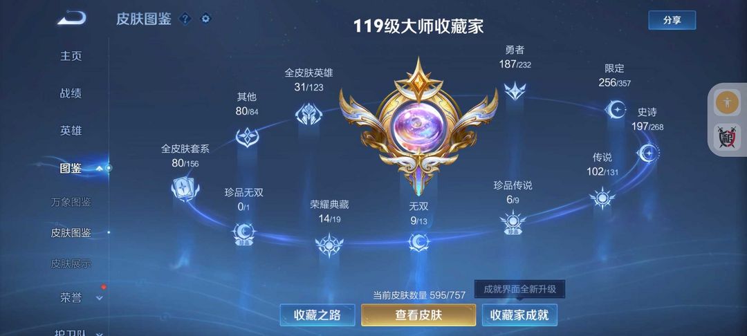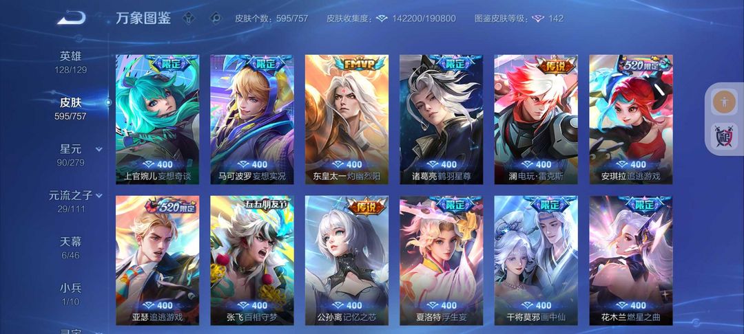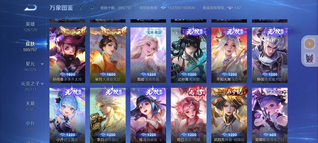 装备描述:595皮肤❤16典藏9无双皮❤102传说kitty小兵6天幕❤离烟恨花合斗❤6珍品传说❤9星传说皮51按键