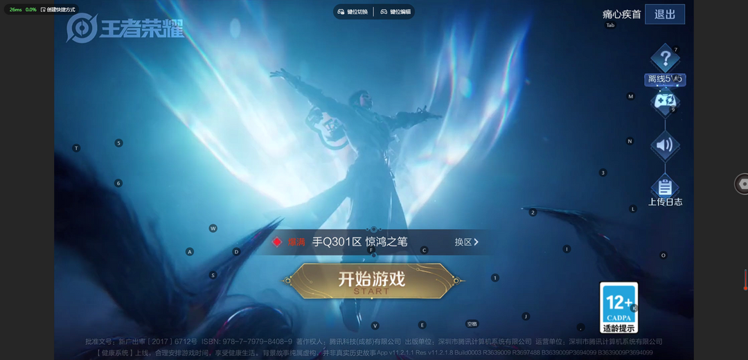 游戏区服:王者荣耀-QQ安卓-QQ账号 -手Q301区-惊鸿之笔