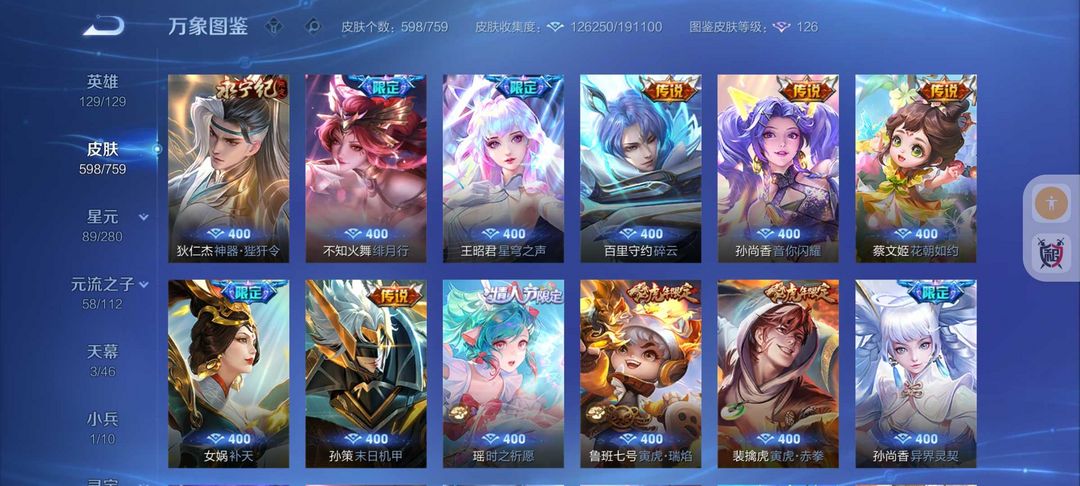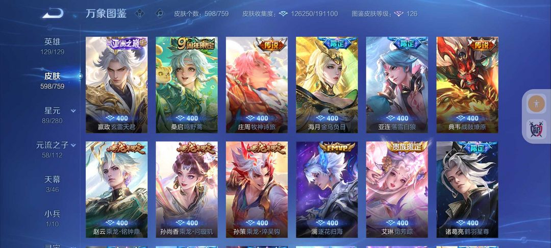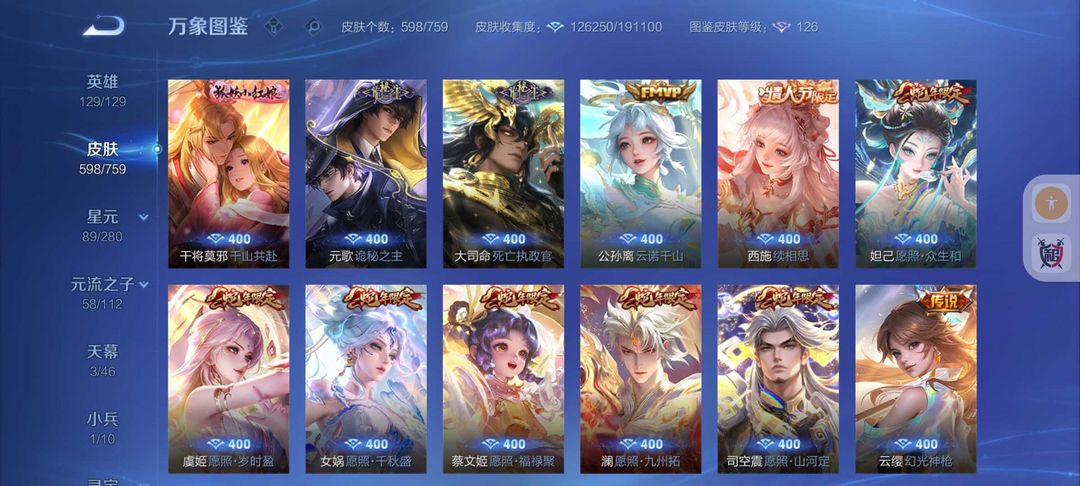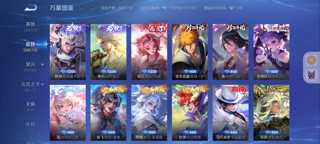 598皮肤冰雪小兵❤11典藏6无双天机白泽❤8珍品宫本暃死神联动诡秘之主联动新皮❤FMVP生肖年限皮