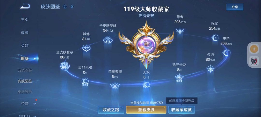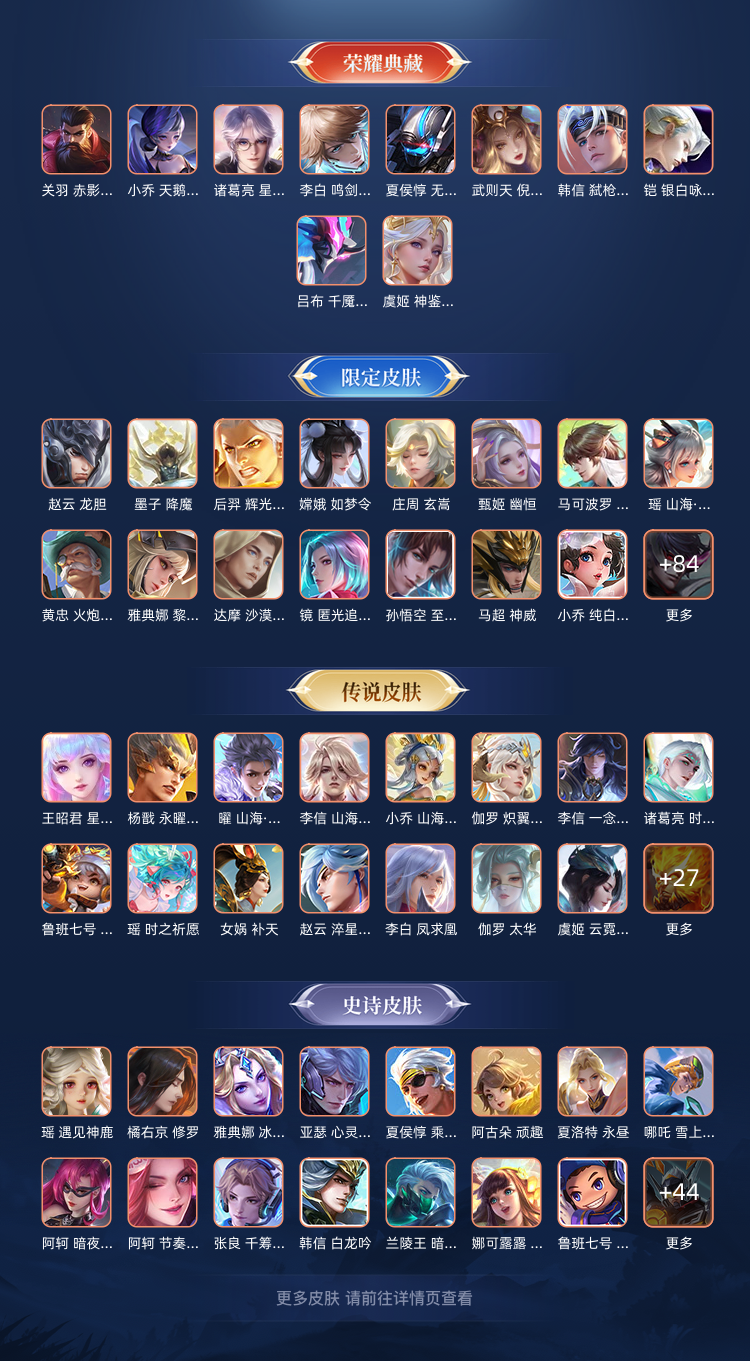 装备描述:598皮肤冰雪小兵❤11典藏6无双天机白泽❤8珍品宫本暃死神联动诡秘之主联动新皮❤FMVP生肖年限皮❤