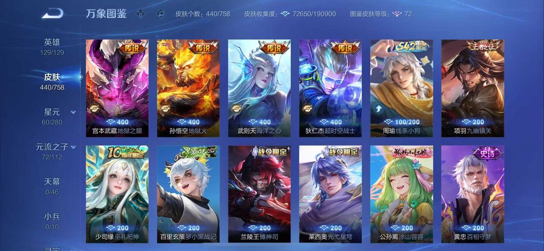 装备描述:522皮肤8典藏5无双皮❤76传说❤线条小狗小兵❤花合斗真我赫兹满蛇年限定续相思情人节限定
