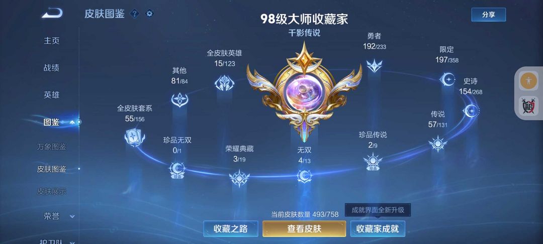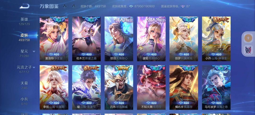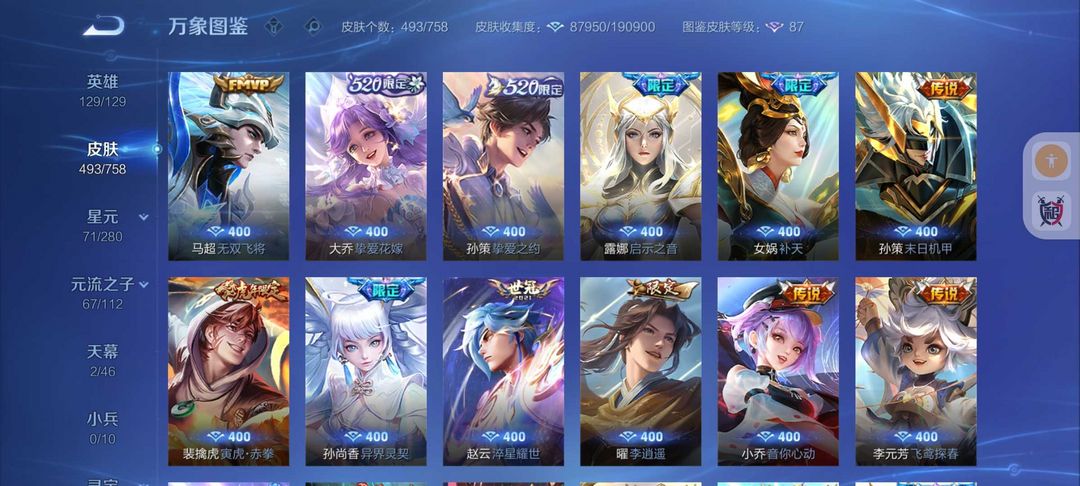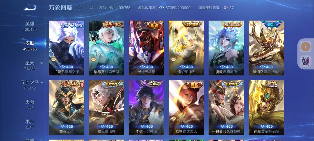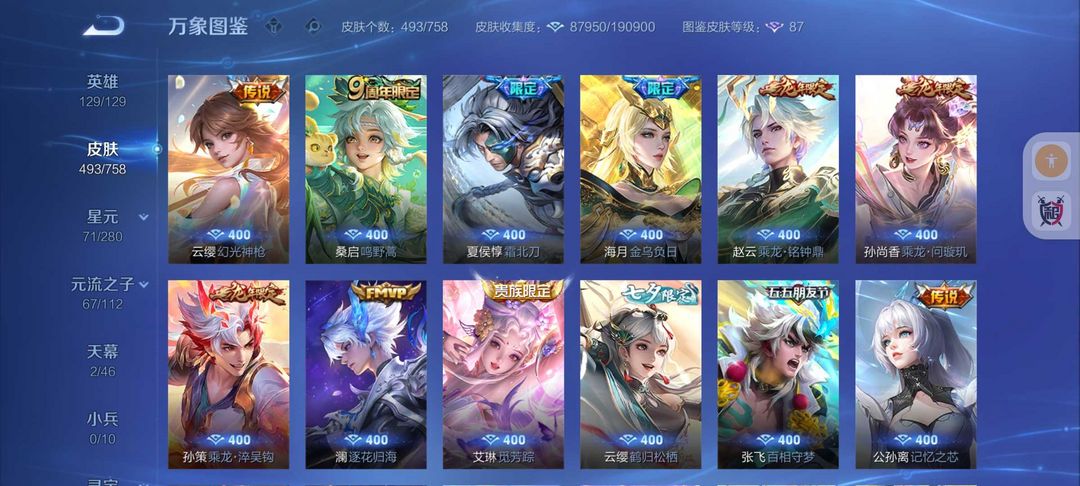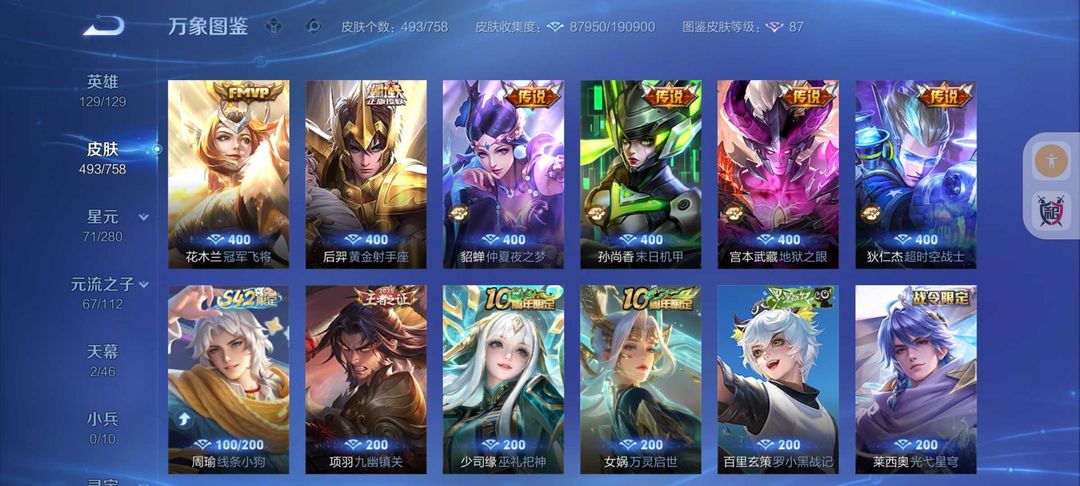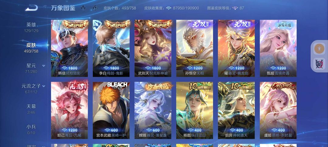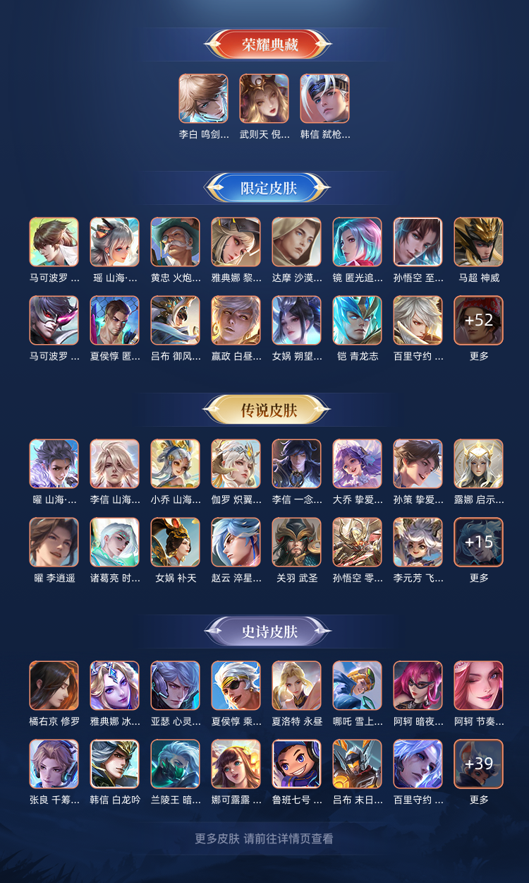 装备描述:493皮肤❤️4水晶4无双❤️猴子无相无双宫本死神联动❤️杨戬新皮10周年限定曜无双倪克斯神谕❤️
