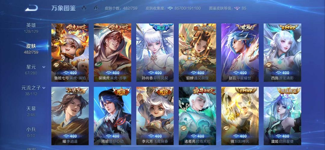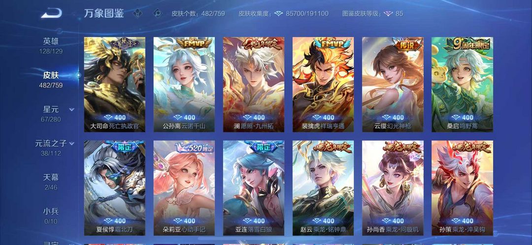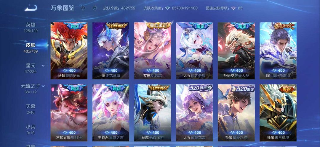 装备描述:482皮肤4水晶2无双皮❤猴子无相无双李白无双❤暃死神联动杨戬十周年❤诡秘之主凯典藏52传说皮❤