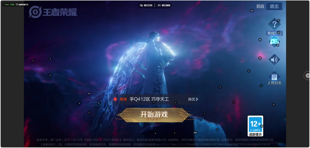 游戏区服:王者荣耀-QQ安卓-QQ账号 -手Q412区-巧夺天工