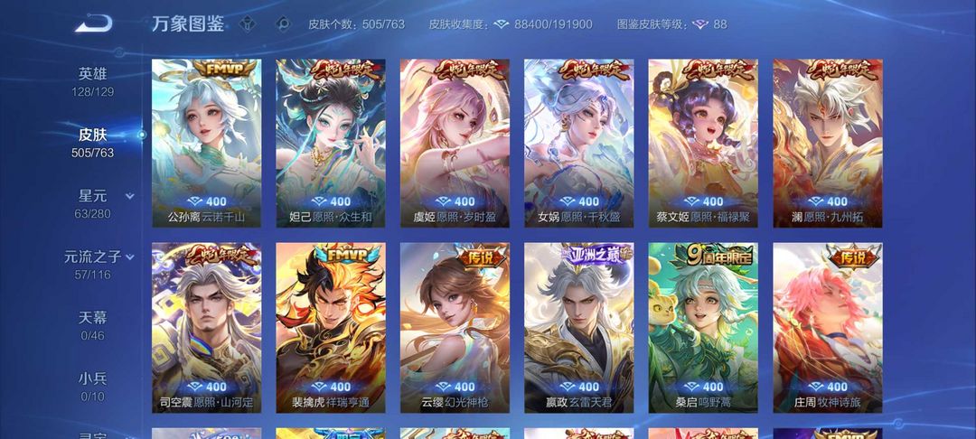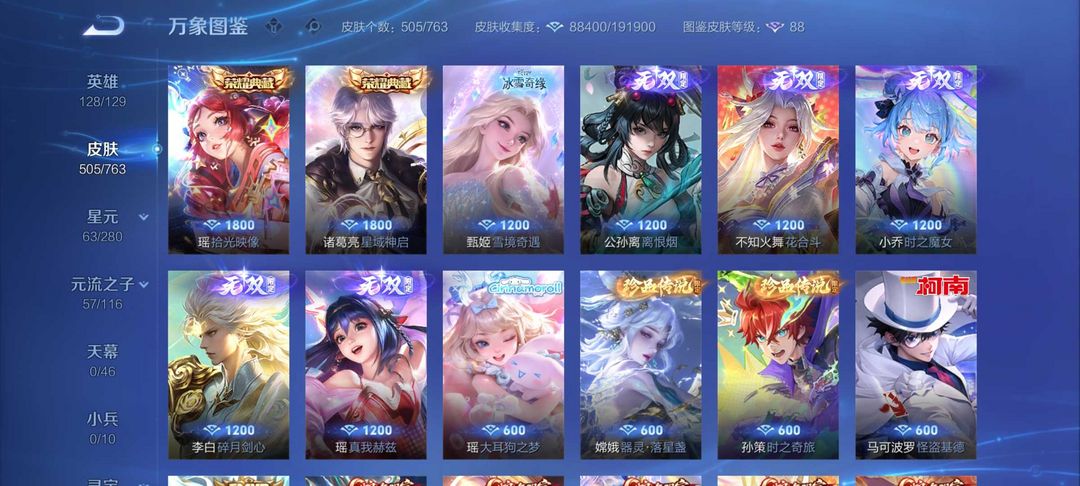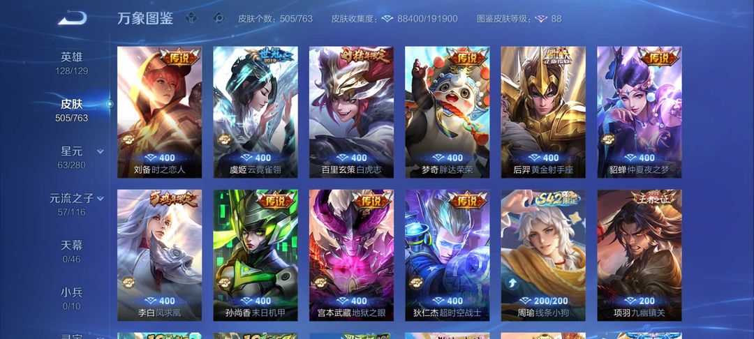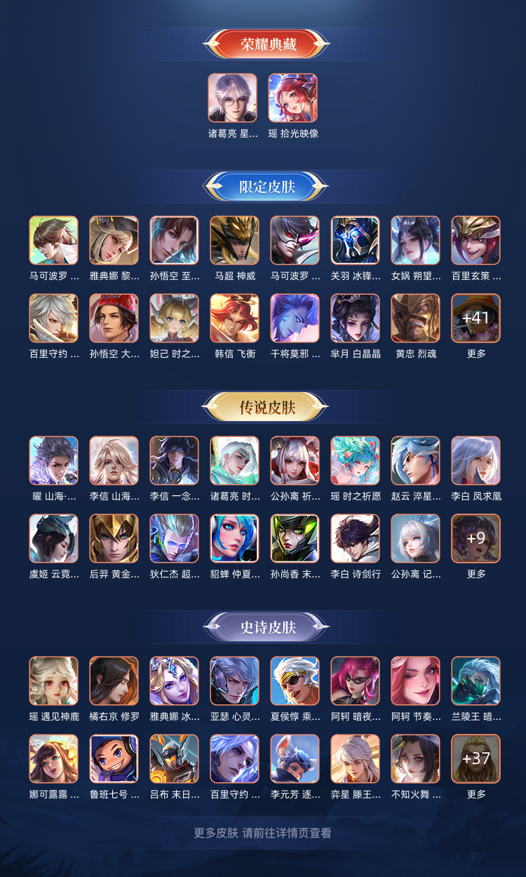 装备描述:504皮2典藏6无双皮❤离烟恨花合斗瑶无双瑶典藏❤紫瑶大耳狗满蛇年限定皮❤