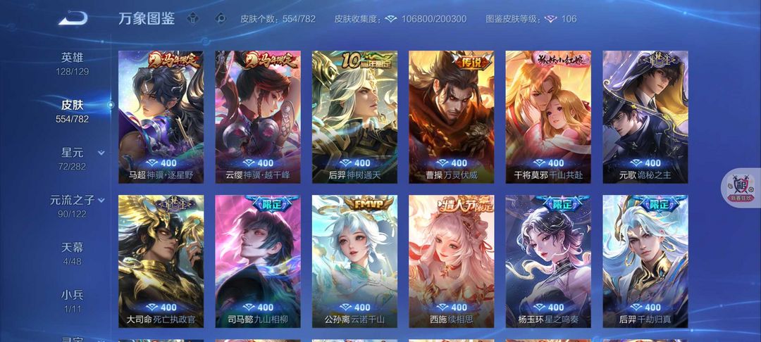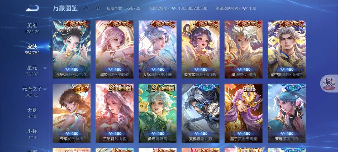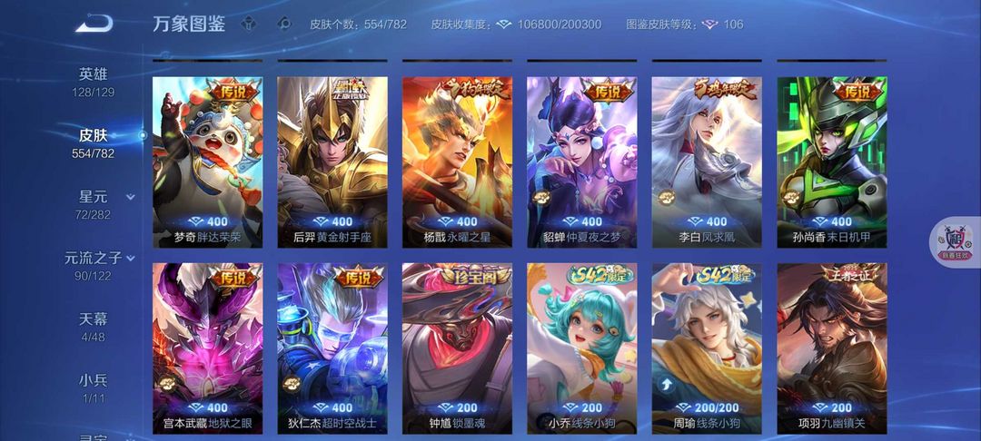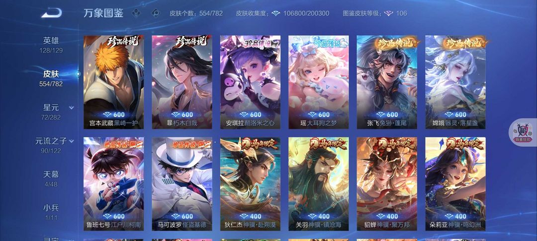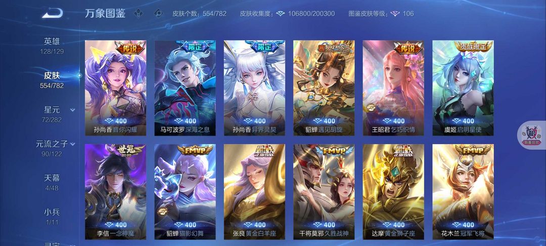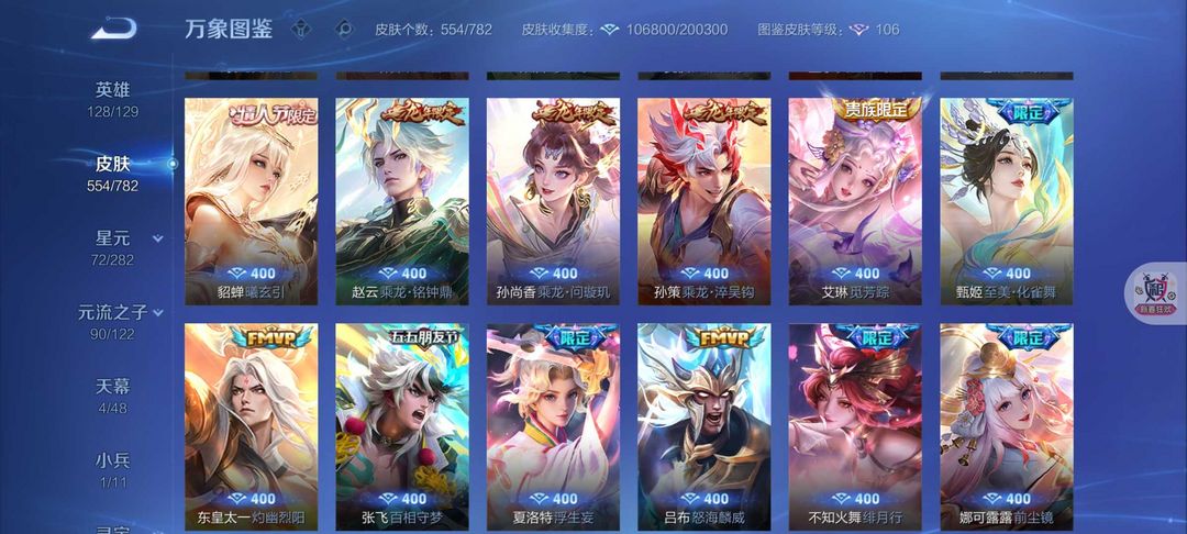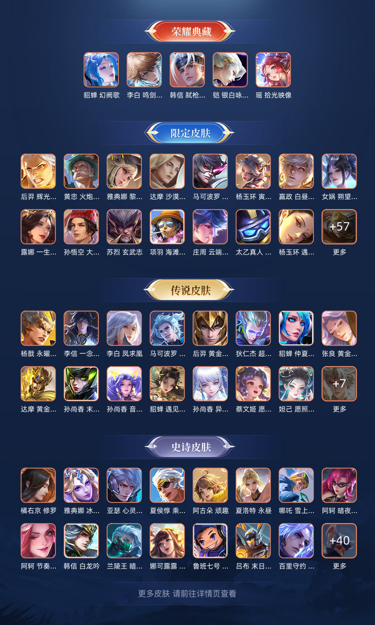 554皮肤❤7典藏貂蝉馥梦繁花9珍品5无双❤️满马年限定❤️伽罗珍品天机白泽螭龙剑离烟恨露比小兵