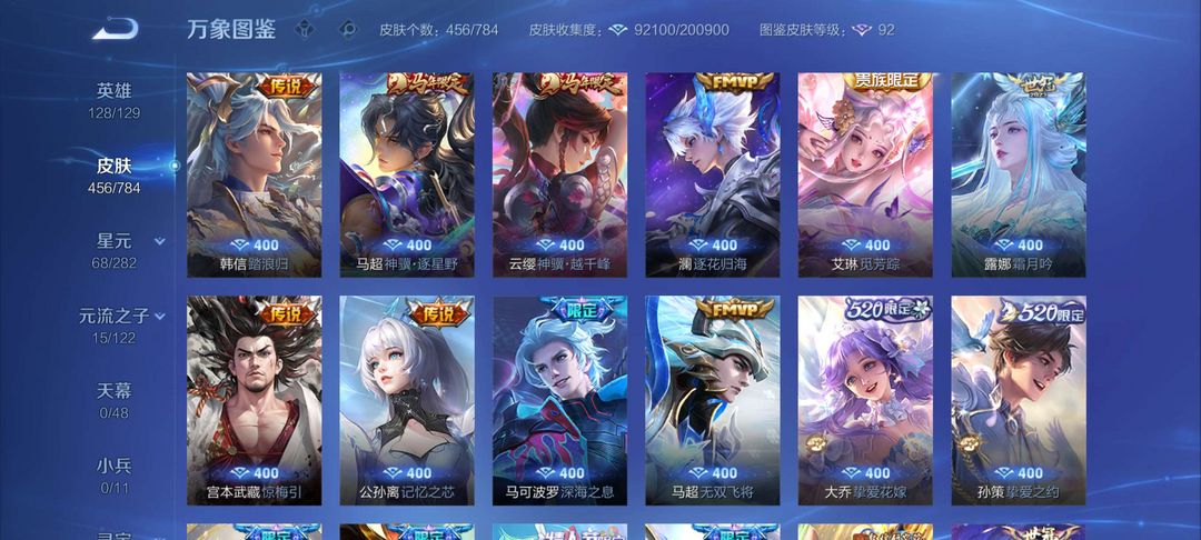 限制: 撤单率<90%才可租用此帐号装备描述:毁号,涉及毁坏虚拟财产罪及计算机安全罪,请文明游戏素质游戏,让我们共建美好租号平台 本游戏账号: 英雄多皮肤多。典藏皮肤3个感受典藏皮肤带来的优质体验快感FMVP皮肤7个尽情享受FMVP皮肤带来的主角光环 私人所属英雄皮肤有:孙尚香 杀手不太冷花木兰 九霄神辉铠 银白咏叹调百里守约 碎云孙尚香 音你闪耀孙尚香 末日机甲孙尚香 异界灵契关羽 武圣李信 山海·炽霜斩李信 一念神魔李白 诗剑行诸葛亮 武陵仙君诸葛亮 鹤羽星尊孙悟空 齐天大圣孙悟空 零号·赤焰上官婉儿 神器·万象笔上官婉儿 妄想奇谈李元芳 飞鸢探春大乔 挚爱花嫁狄仁杰 超时空战士狄仁杰 神器·狴犴令狄仁杰 夜礼服假面王昭君 星穹之声王昭君 乞巧织情后羿 无尽星芒后羿 黄金射手座虞姬 云霓雀翎虞姬 无限倾心虞姬 启明星使娜可露露 前尘镜貂蝉 仲夏夜之梦瑶 时之祈愿不知火舞 绯月行澜 电玩·雷克斯孙策 挚爱之约蔡文姬 花朝如约鲁班七号 寅虎·瑞焰女娲 补