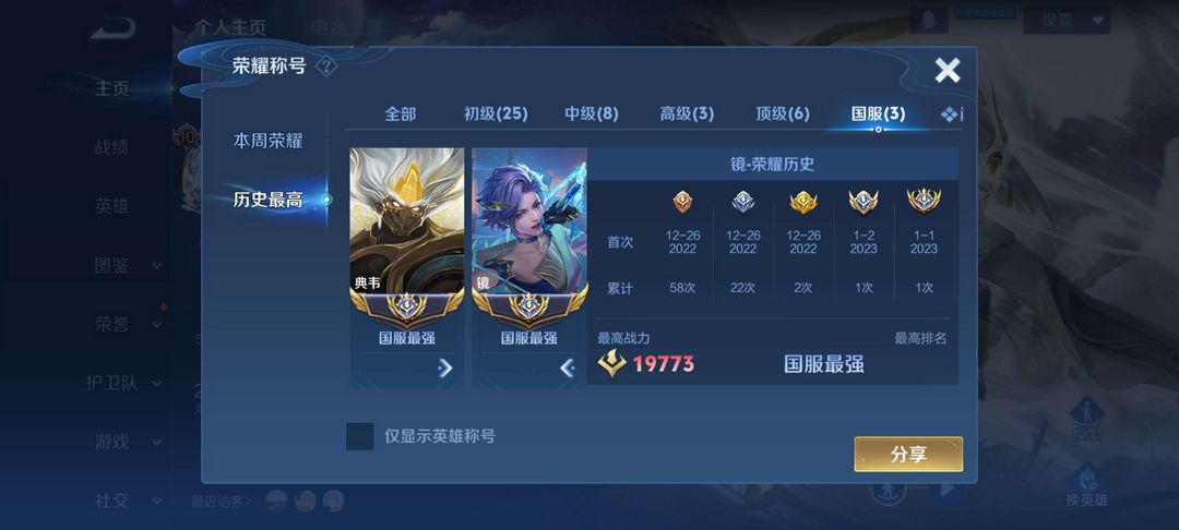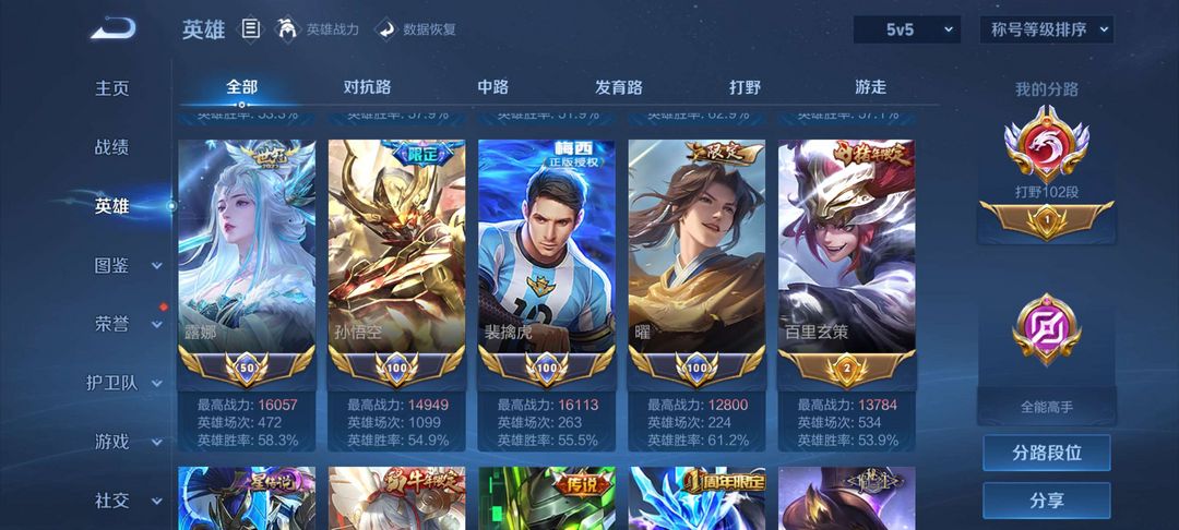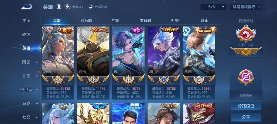 102段顶级打野✨三大国六小国✨准2w战1.97大国镜✨大国韩信典韦✨国服澜露娜老虎✨极品国标