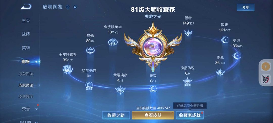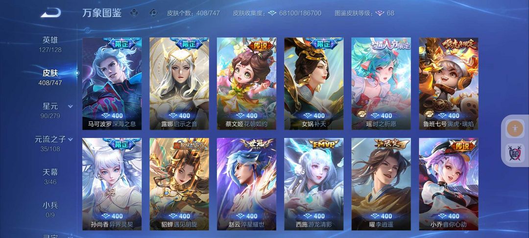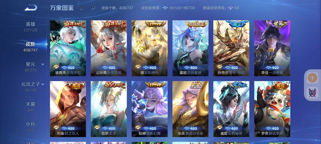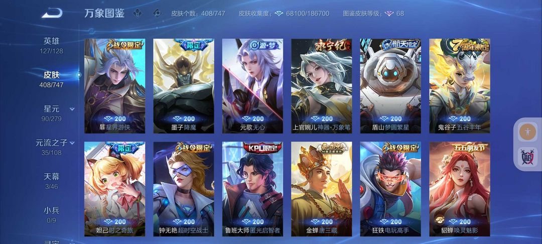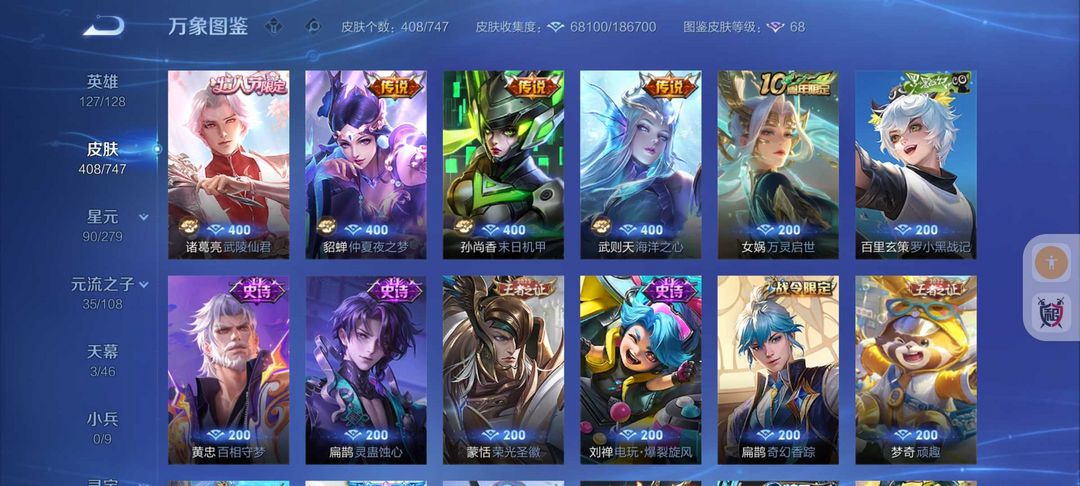 装备描述:368皮肤4水晶新皮肤号 V10号 幻阙歌 天鹅之梦 倪克斯神谕 浮生妄 燃星之曲 满兔年 星穹之声 深海之息 补天 等超多限定皮肤