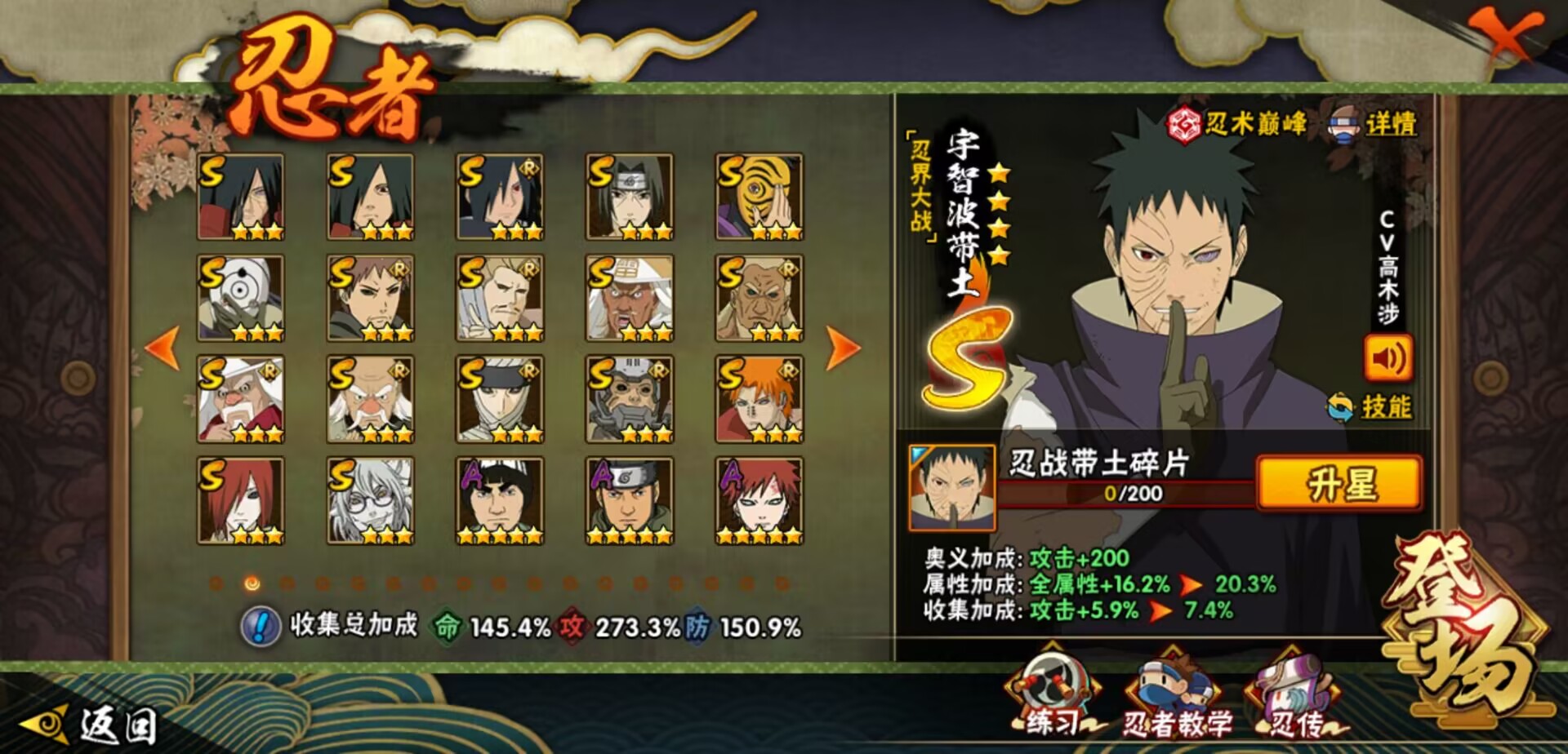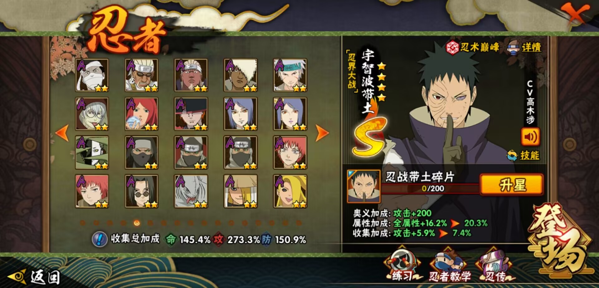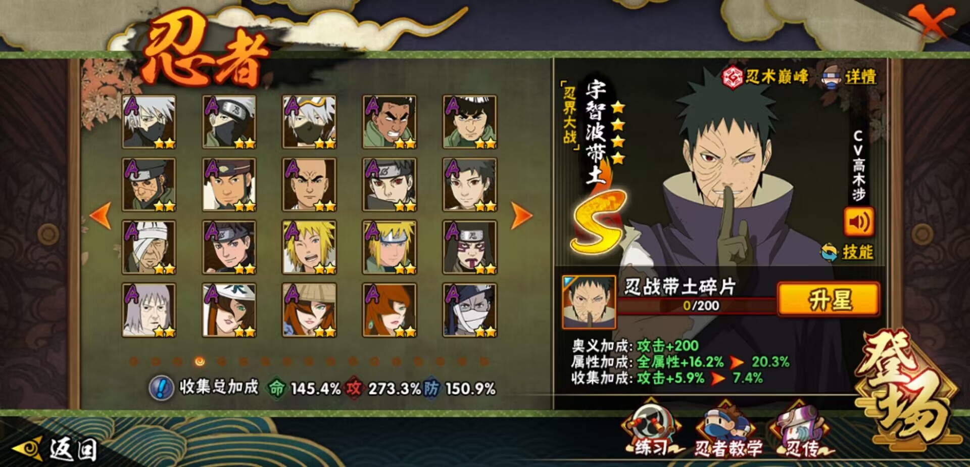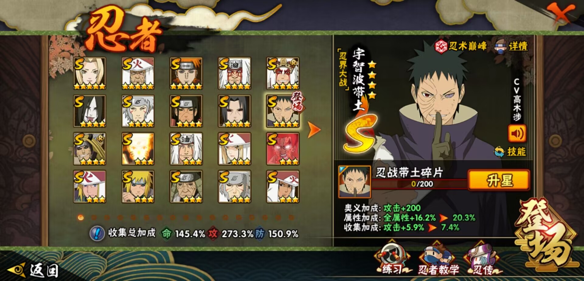 妖怪纲手五影会谈斑⚜️399忍须佐卡卡西⚜金身水门六尾鸣人漂泊小南⚜️充值7W⚜️至尊全满配置