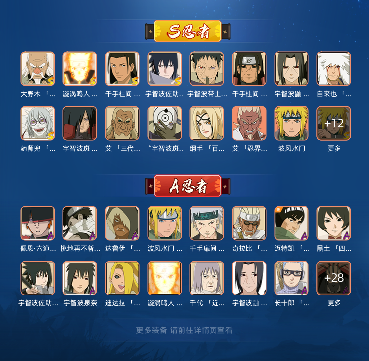 装备描述:25S 38A 198忍者 千手扉间「漂泊武士」/佩恩·六道 「漂泊浪客」/小南 「漂泊浪客」/长十郎 「六代目水影」/神秘面具男 「红夜之刃」/宇智波斑 「秽土转生·解」/千手柱间 「木叶创立」/漩涡鸣人 「九喇嘛连结」/宇智波带土「忍界大战」/宇智波佐助 「永恒万花筒」/迈特凯「死门」