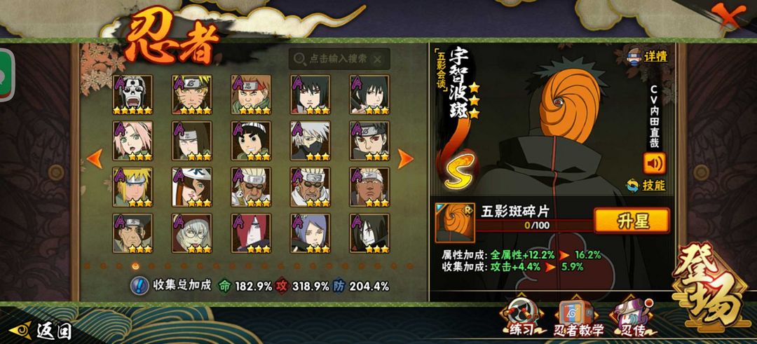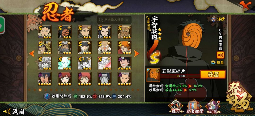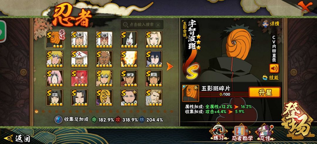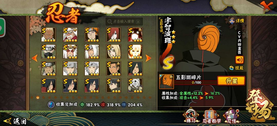 装备描述:秽土.解.斑(万花简)佐助❤红夜面具男❤(六代目)长十郎(忍界)小樱❤️九喇嘛鸣人❤️忍战大野木❤️死门凯❤️秽土鼬天道超秽土斑白面具❤️绝阿飞4