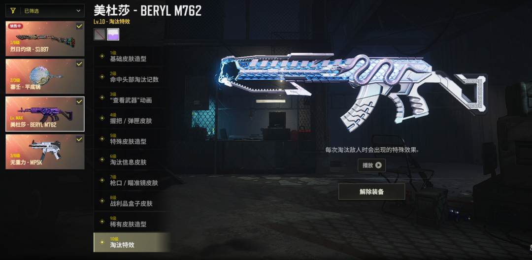 布加迪跑车✅(异色)⑩级美杜莎M762✅(异色)③级无重力MP5✅②塞壬锅✅烈日喷子✅绷带AK白战神