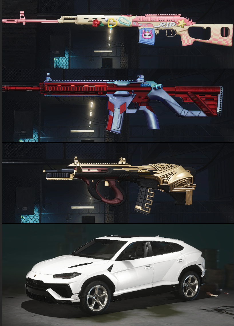 装备描述:可排位/尼尔9S套/兰博基尼SUV【三成长-③无信号M416-弥诺AUG-粉梦德拉贡】山花M762/波浪发型/小马尾/AKM/无重力M249/大金牙/发光套/熊脚
