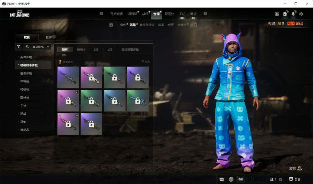 装备描述:可排位✨唐三藏SLR✨弥诺陶洛斯MINI14✨灵魂枷锁AKM✨希腊怪物QBU✨电玩主播套✨渔夫帽✨柏林觉醒长裤✨兴致索然套✨人类猎手探险套✨蓝仙女套✨沙滩兄弟套✨狐狸侯爵套