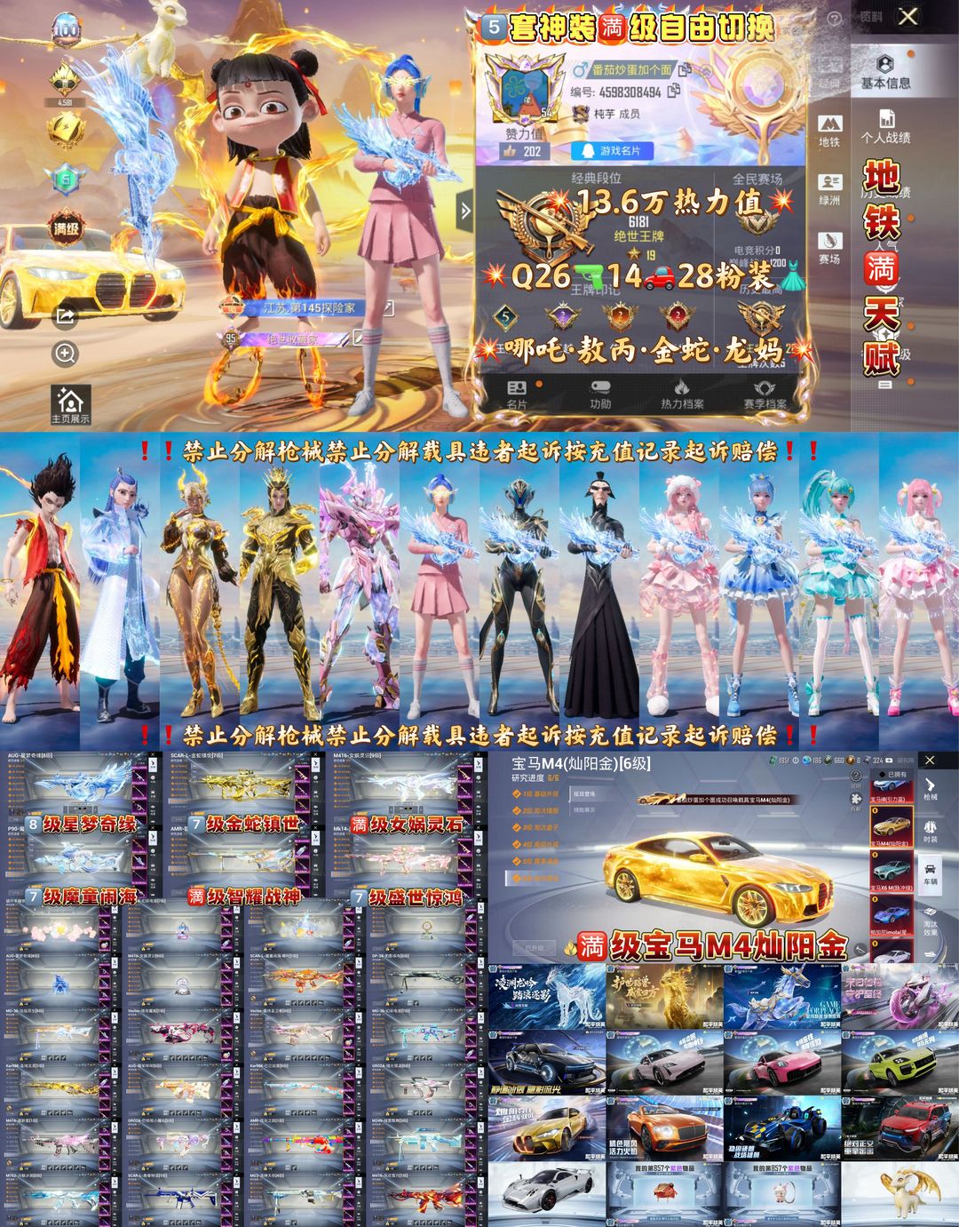 限制: 租号7次及以上 | 撤单率<38.00%才可租用此帐号装备描述:满级哪吒熬丙新老101/满级金宝马M4/满级灵猫魔法师M4/8级星梦奇缘AUG/7级金蛇镇世/5红23粉/26特/13载具