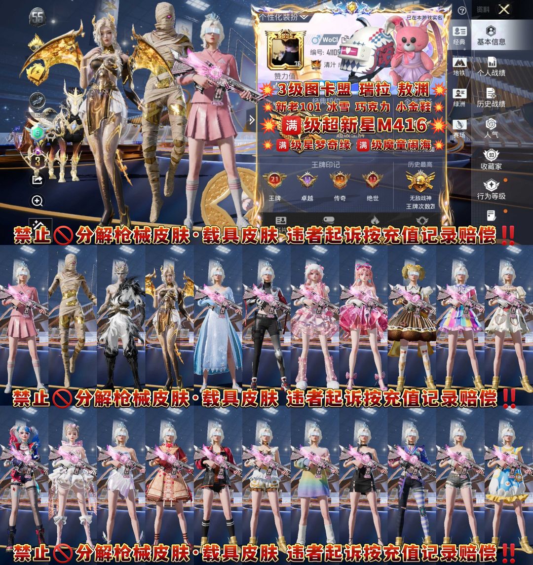 限制: 租号18次及以上 | 撤单率<60%才可租用此帐号装备描述:特别声明!!!! 分解载具枪械永久拉黑不解除 【乱投诉拉黑】和平号有问题/上不去/其他问题/ 特殊需求/投诉没用等问题 账号累计充值超10万!切勿开挂/分解装备/恶意骂人/等等违规行为,发现违规必追查到底(平台登录记录,游戏登录ip手机号 设备串号 充值付款记录不要侥幸现在网警都能调到你的所有行为记录就算盗用他人信息也一样能查到你头上)按账号充值金额=起诉/刑事立案/追责赔偿! 非速玩【非云!本机设备畅玩不卡顿】
