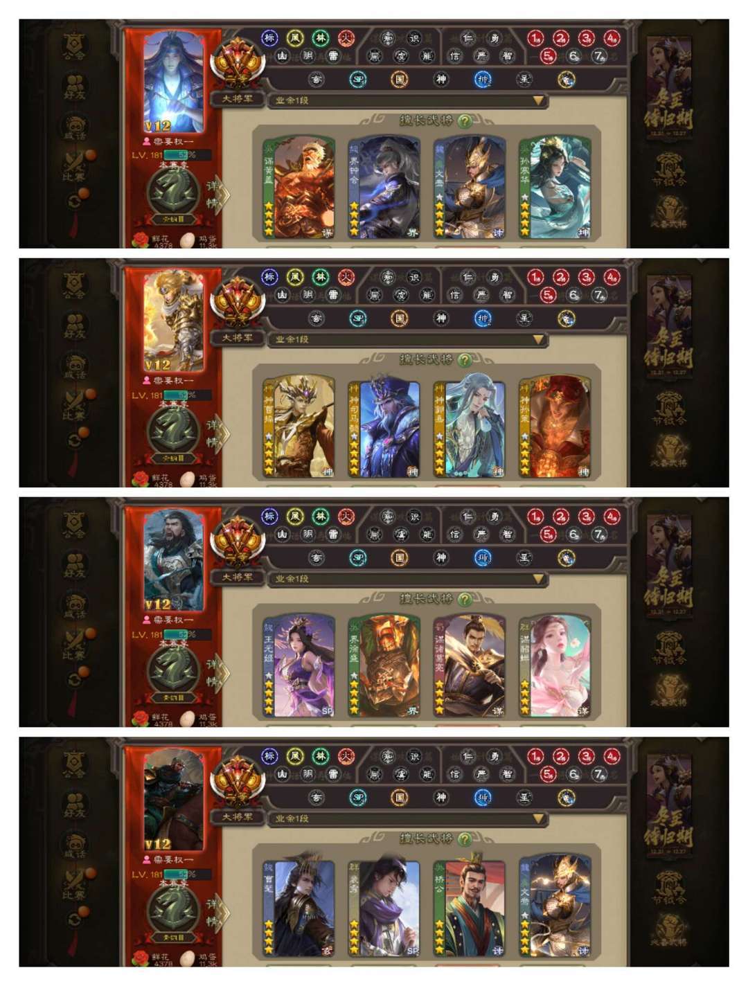 限制: 撤单率<19%才可租用此帐号装备描述:官方二等大将军,有卡,VIP12! 15四星玉龙:回廊至臻双形态动文鸯,回廊至臻双形态动界钟会,奇门动孙寒华,回廊动谋黄盖,回廊动神孙策,回廊动界徐盛,回廊动王元姬,动谋貂蝉动神曹操动谋诸葛亮,金神司马懿,曹髦神郭嘉裴秀! 53史诗武将,动留赞动神赵云动戏志才动星周不疑,金谋曹仁金界左慈金界李儒金司马徽,神鲁肃十常侍杜预郑玄王朗周处南华老仙,鲍信张绣谋大乔谋小乔谋荀彧等! 53动皮120金皮205国战皮肤!