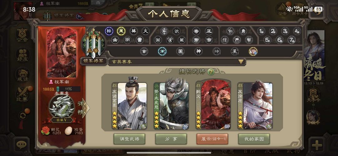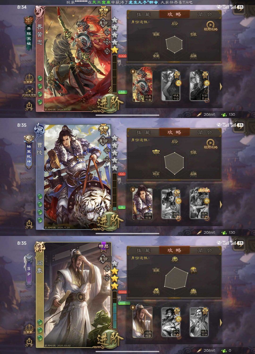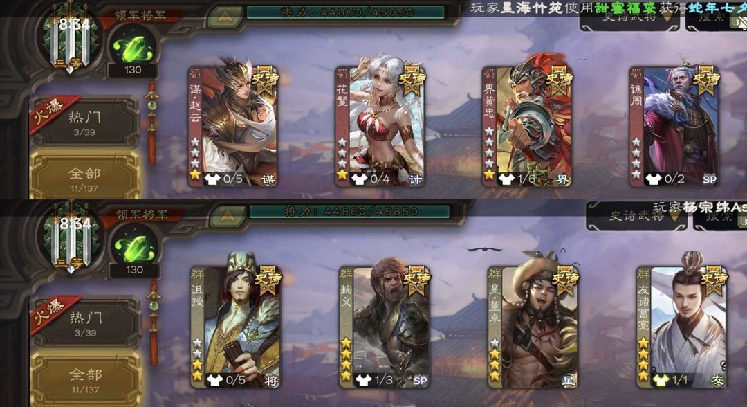 装备描述:友诸葛亮 势太史慈 友徐庶 动麹义 阎象 星董卓 界黄忠 曹纯