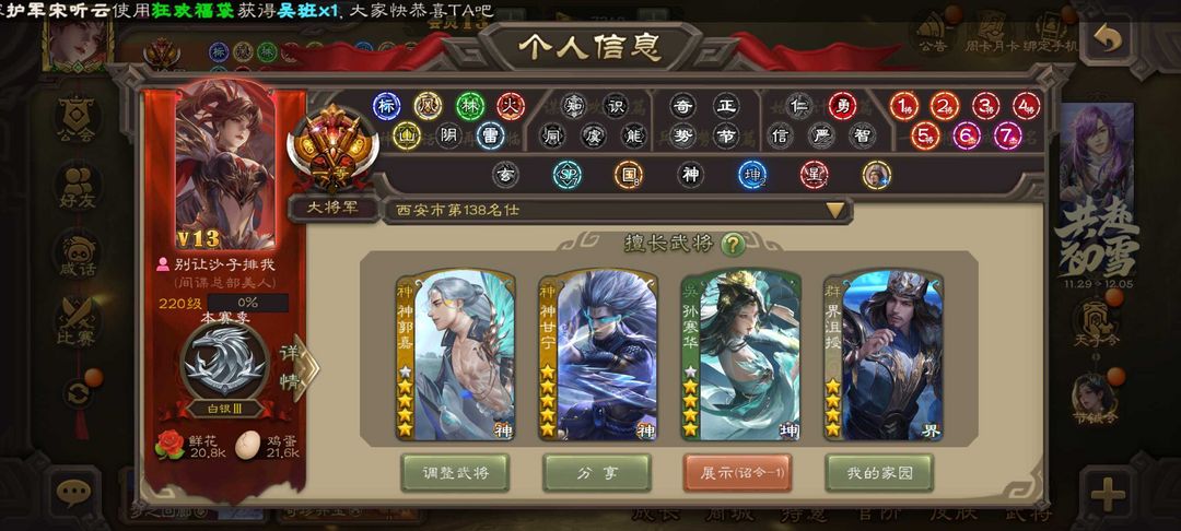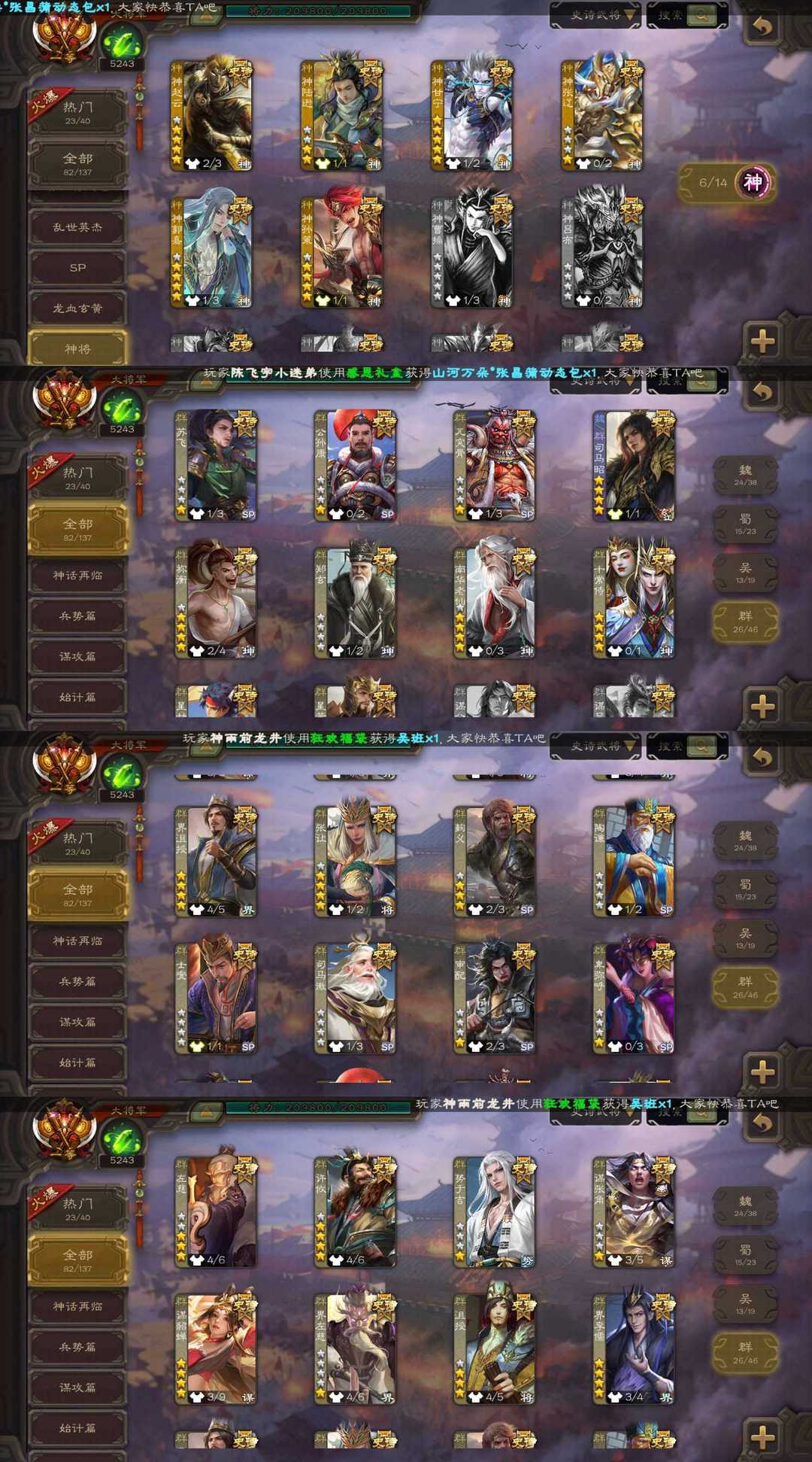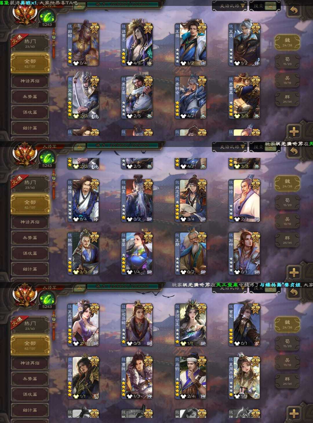 装备描述:【免费点将】v13⚡动态神甘宁神郭嘉⚡十常侍天子令谋曹丕⚡曹髦⚡谋诸葛亮⚡势太史慈⚡双形态文鸯奇门孙寒华⚡动态界沮授⚡ 魏:天子令谋曹丕 双形态文鸯 戏志才 曹婴 双形态界钟会 动态清河公主 曹髦 马钧 蜀:谋诸葛亮 谋马超 张星彩 吴:孙寒华 留赞 神太史慈 谋孙策 谋黄盖 骆统 界徐盛 群:双形态司马昭 十常侍 祢衡 界沮授 审配 谋张角 谋貂蝉 神:动态神郭嘉 动态神甘宁 动态神孙策