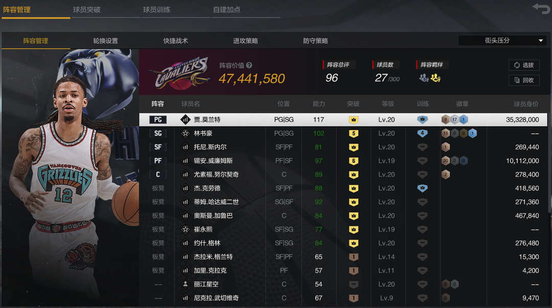 限制: 租号1次及以上 |装备描述:【满突满训贾莫兰特】枪王莫兰特,炸裂扣篮,6锡安带王朝阵容 可以打排位赛,街头段位:当家球星,王朝段位:职篮新秀 信誉分:100,更新时间:10.19 请勿消极游戏、强退游戏等扣罚信誉分行为,最后几分钟请勿再开始排位或者匹配,希望您开一把自定义,感谢您的配合与理解