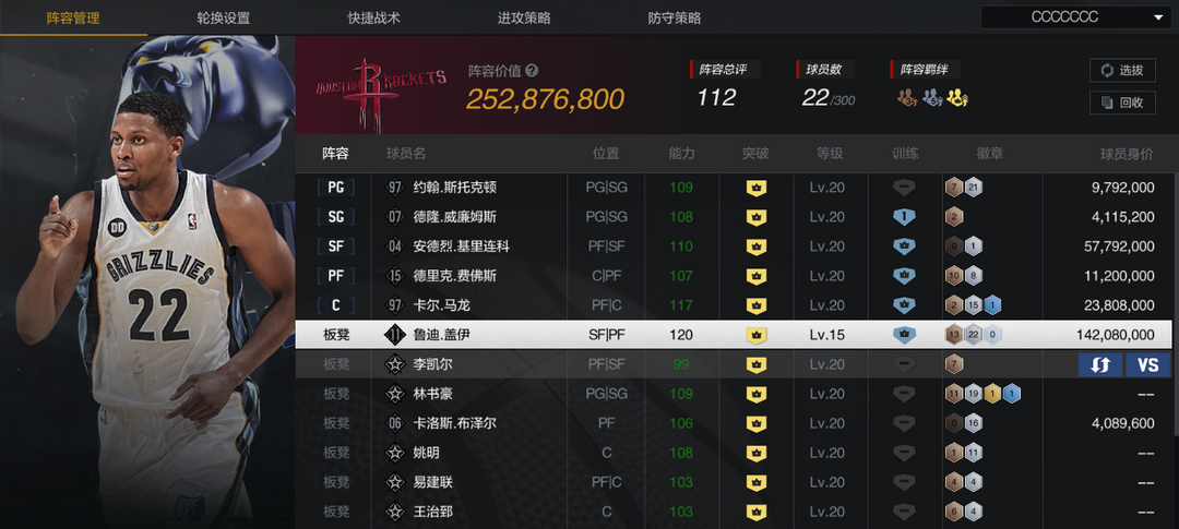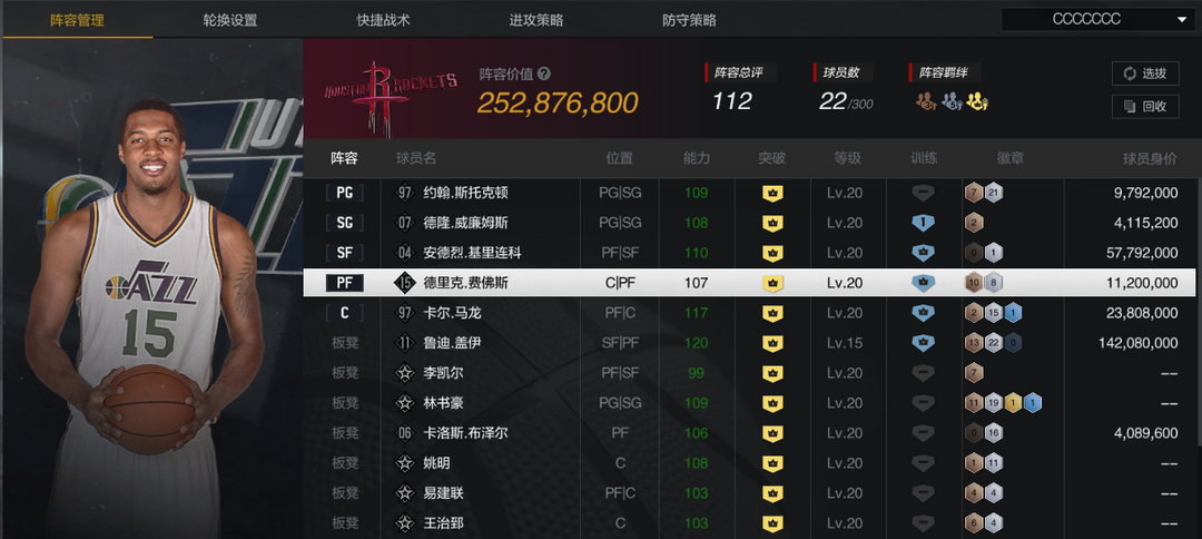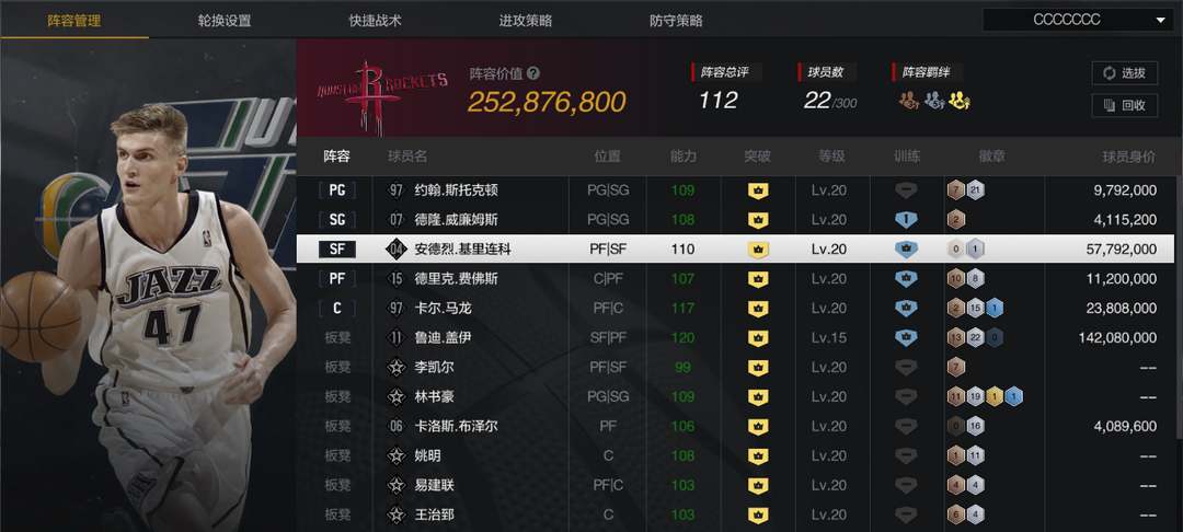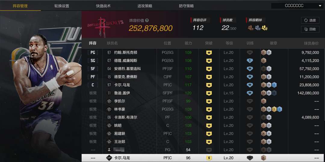 装备描述:【巅峰爵士套】【6盖伊】【10突AK】【10斯托克顿/马龙/德隆/布泽尔】【5复刻马龙】
