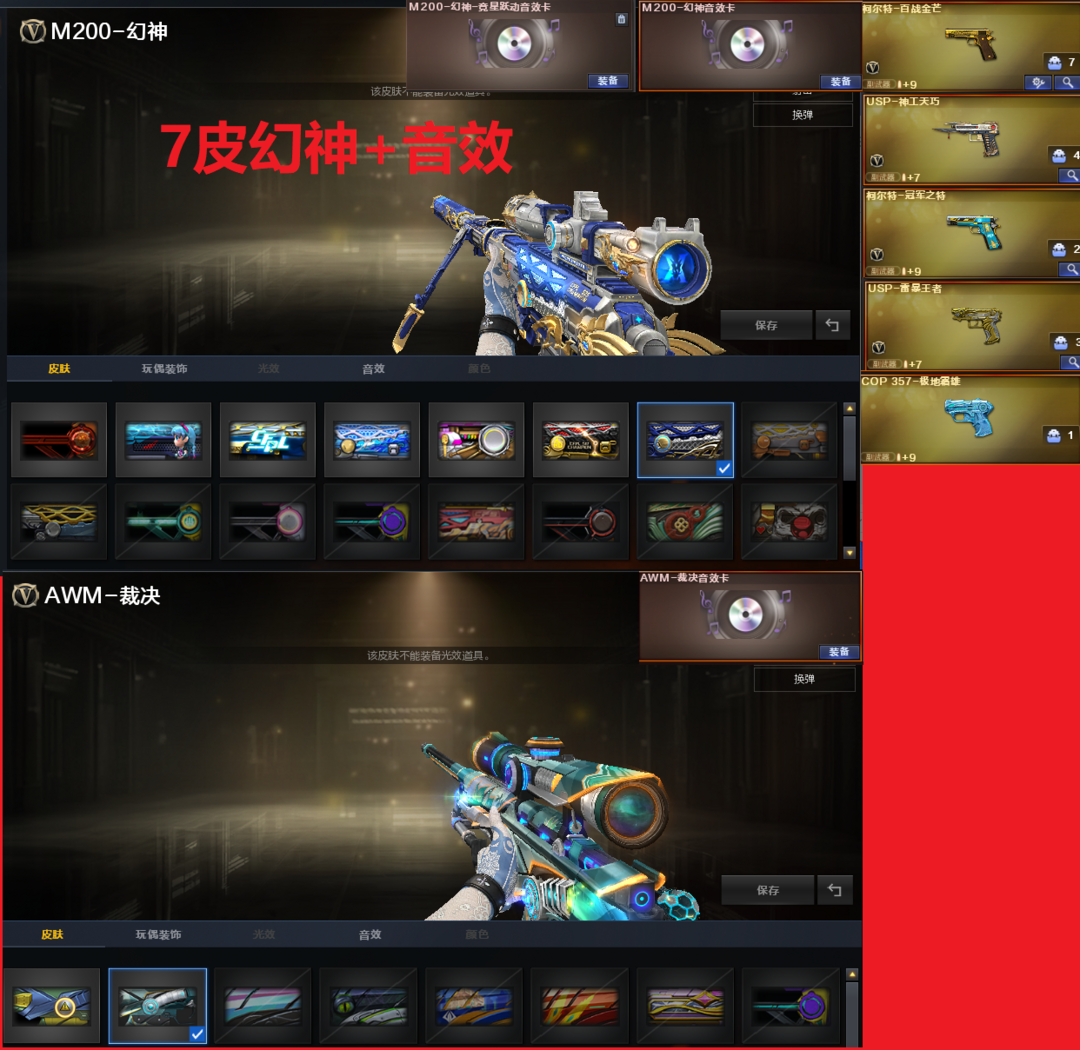 装备描述:排位:可以、、、、、、、、、、、、爆破四防:幻神7皮+音效(KZ冠军、EP荣耀、白鲨、冠军之幻、AG、丹凤、动感闪耀皮肤)、USP雷暴王者、USP神工天巧、柯尔特百战金芒、COP极地霜雄、、、、白虎、QBZ金色蔷薇、炽芒蝶刃、、、幻神音效、裁决音效、蔷薇音效、毁灭音效、极光音效、黑骑士音效、、、1套竞技荣光、1套神工天巧、2套玄豹、1套雷暴王者、、、爆破四防(传说艾莉莎、妮妮、鹰)